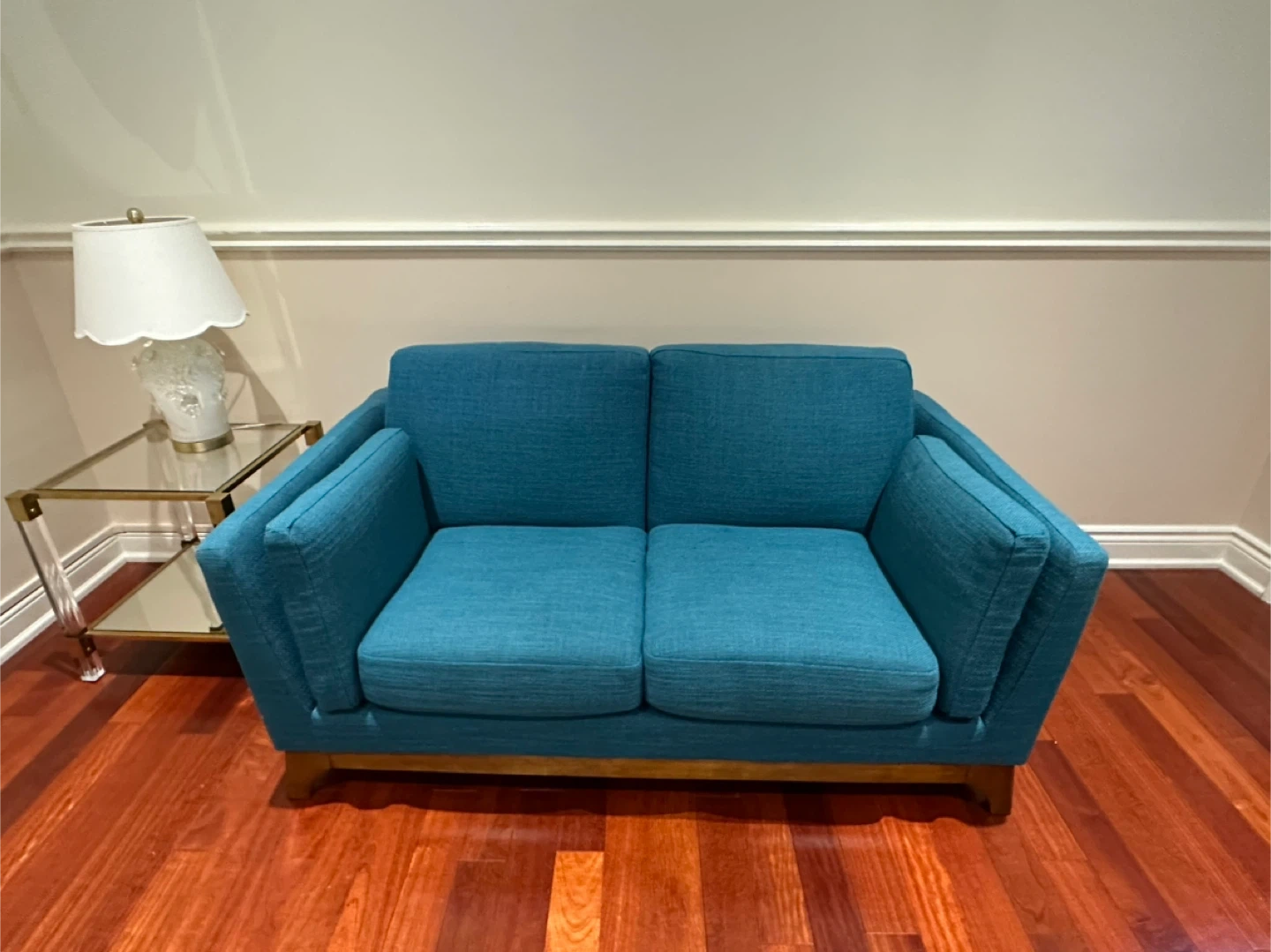 253Original price: 1200+ HST This Article brand loveseat fuses the classic with the modern with its plush seating, sleek track arms and clean design lines. Its beautifully crafted wooden base with slanted legs enhances its strong and sturdy construction, while its detachable cushion seats, backrests and armrests allow you to snuggle up comfortably. Style Mid-century modern General Dimensions 31"H x 61"W x 35"D Seat Height 16" Seat Depth 23" Arm Height 24" Weight (lbs) 92 Wood Stain Walnut Upholstery Color Teal