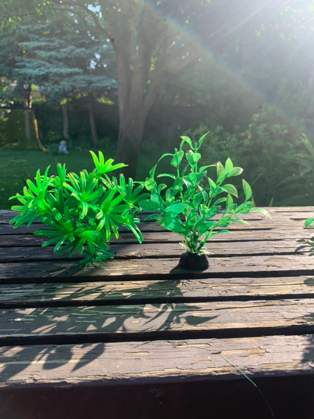 Aquarium plant decoration. Offering two lovely artificial plants for an aquarium. Plants are green, with realistic-looking details. They will give your fish a safe and soothing environment.