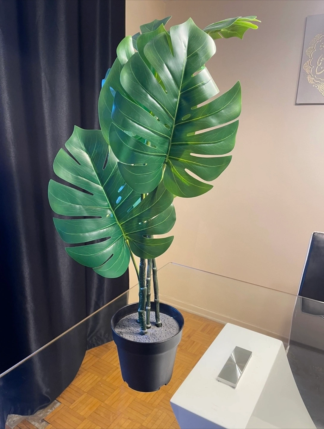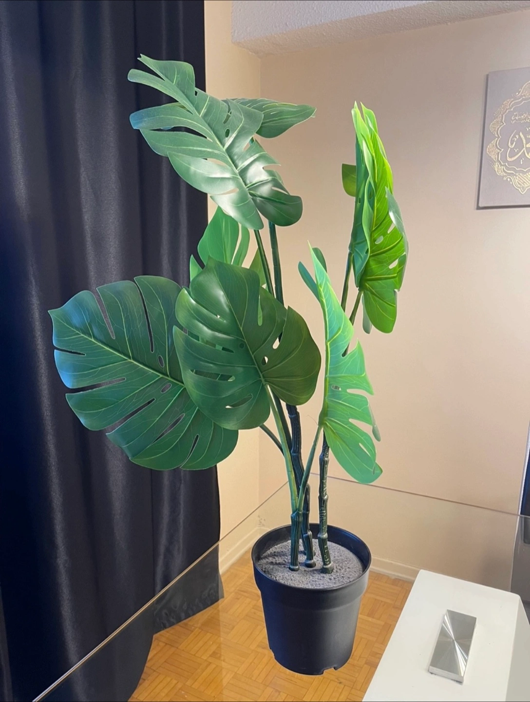 72Artificial monstera deliciosa plant. Lifelike leaves. Black plastic pot. Perfect for home décor. No watering required.