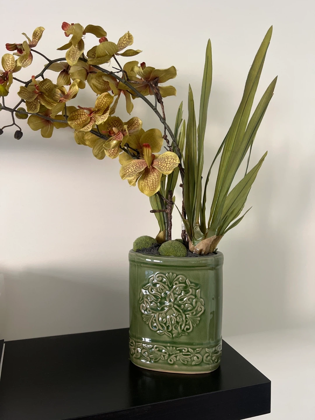 This is a lovely artificial orchid plant in a decorative green ceramic pot. It's perfect for adding a touch of nature to your home without the maintenance of a real plant. The pot has a beautiful embossed design, adding to its charm