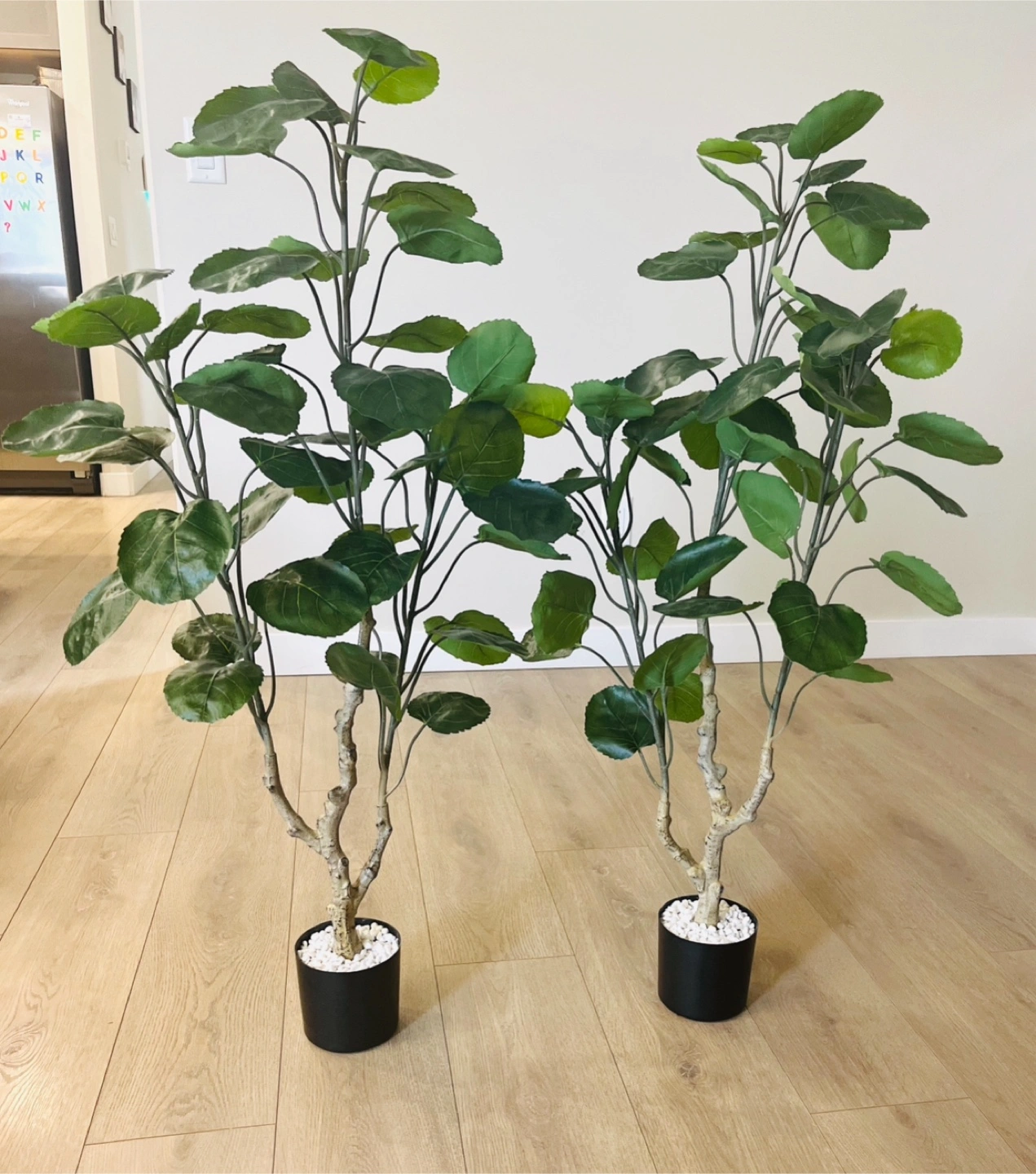I'm selling two artificial plants, each with a black pot. Plants feature green leaves and what appear to be realistic stems. White stones are in the pots. They would make a beautiful addition to your space, adding a touch of nature.