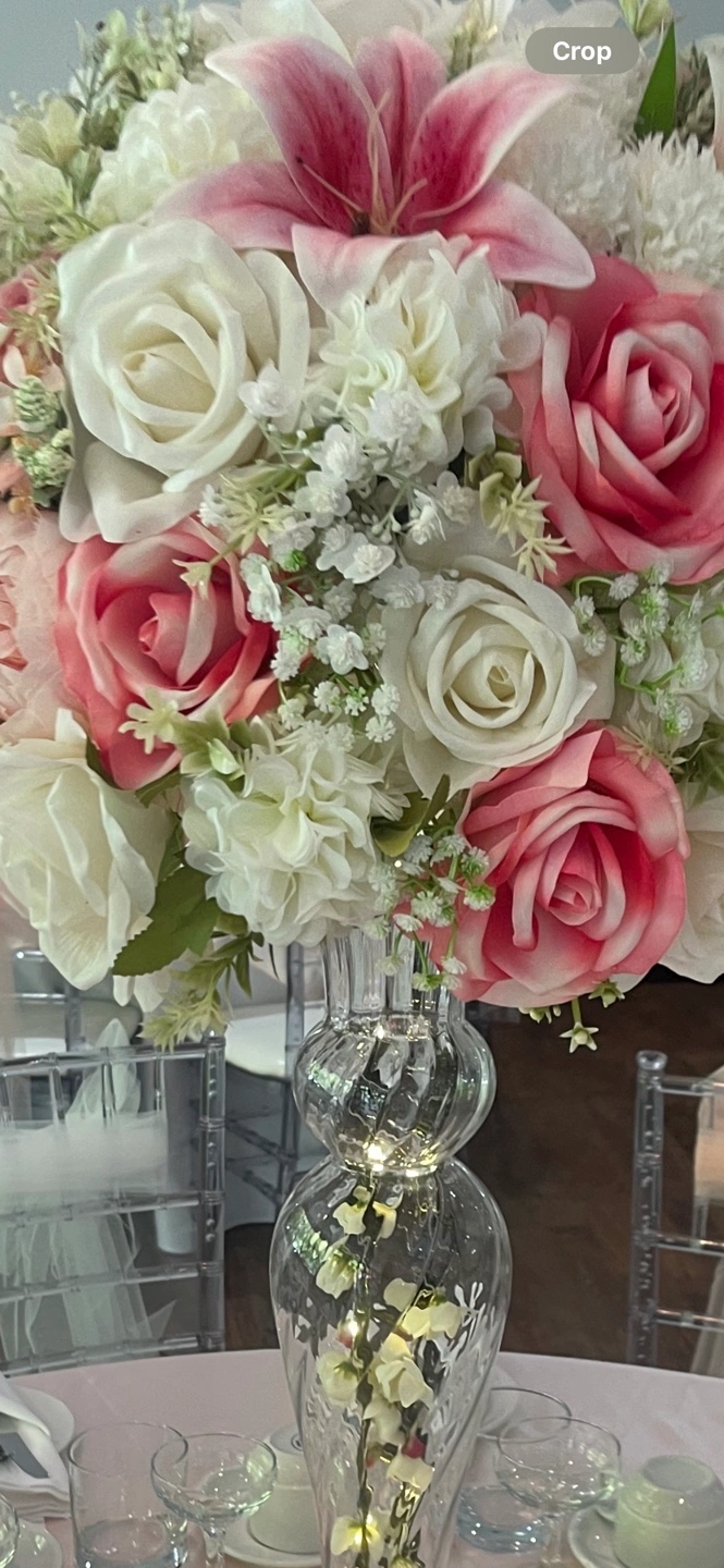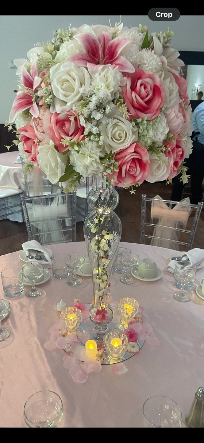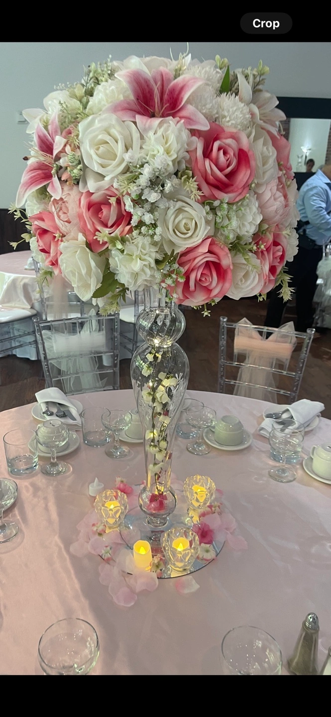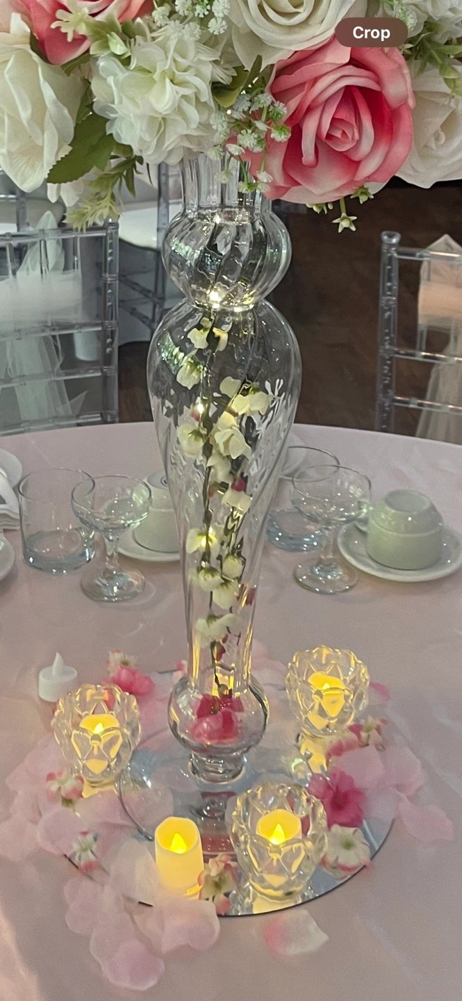 76The flowers are displayed in a clear glass vase, which is filled with delicate artificial blooms inside for added depth and detail. Around the base, soft rose petals and LED candles create a warm, glowing effect, making the piece perfect for evening celebrations. I made them for my daughter’s Quinceañera I have a Total of 13 of them. It cost me $300 - $500 to make each one of them.