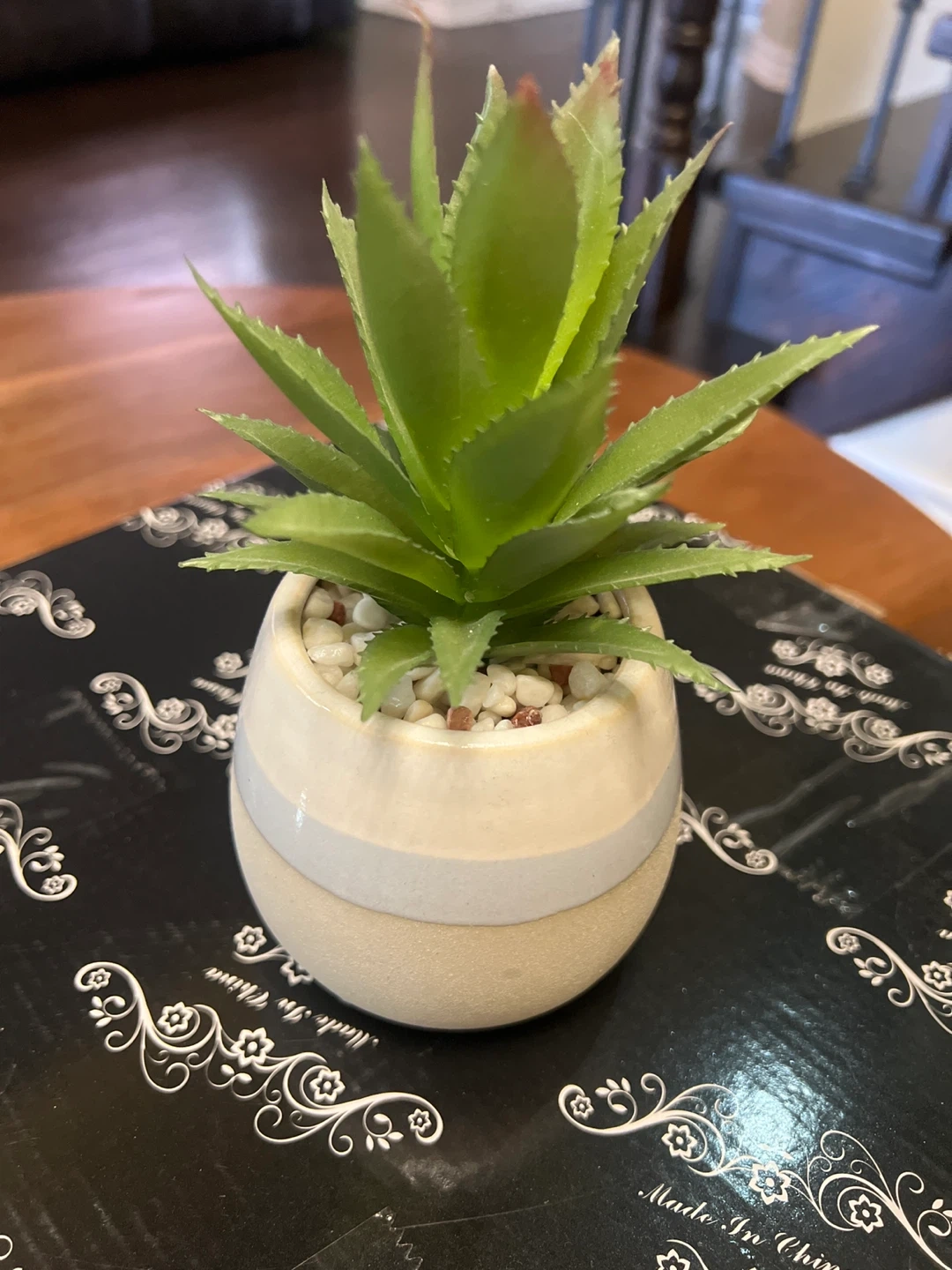 65Here's a cute little artificial succulent in a pot. It would look great on a desk or shelf to add a touch of greenery to your space