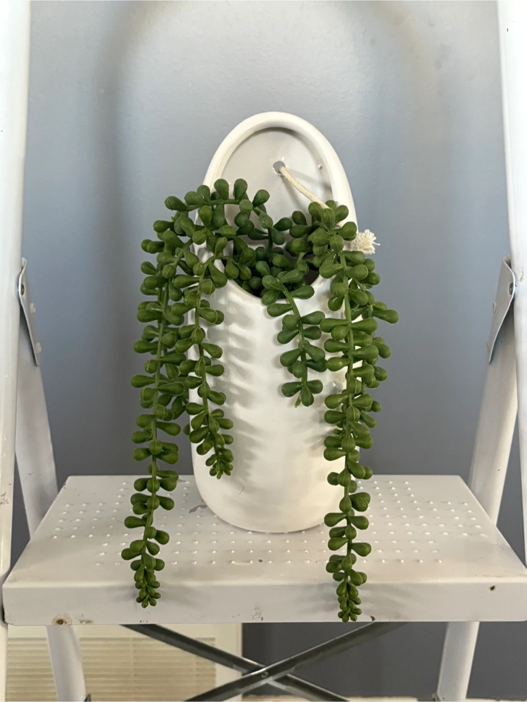 44Add a touch of greenery to your space with this artificial trailing succulent! It comes in a simple, stylish white ceramic pot that will complement any decor. Perfect for shelves, desks, or hanging on the wall. Never used, as is and pick up only.