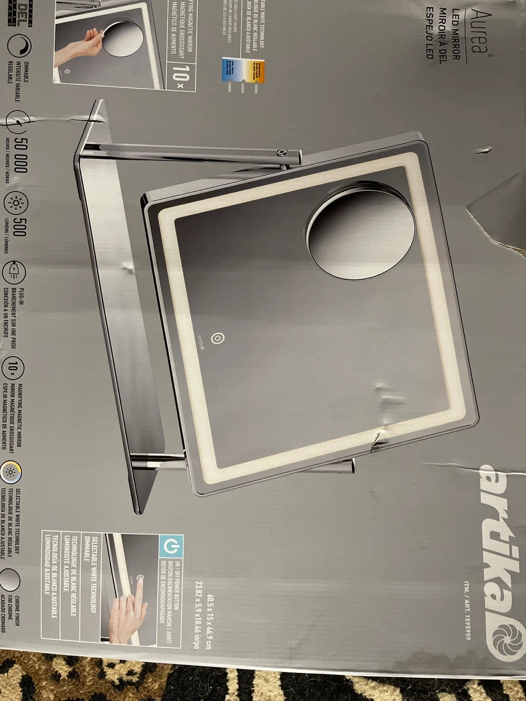 Selling an Artika Aurea LED mirror that's in excellent condition. It features adjustable and selectable white technology, dimmable lighting, and a 10x magnifying magnetic mirror! It also has a chrome finish and measures 60.5 x 15 x 46.9 cm (23.82 x 5.9 x 18.46 in).