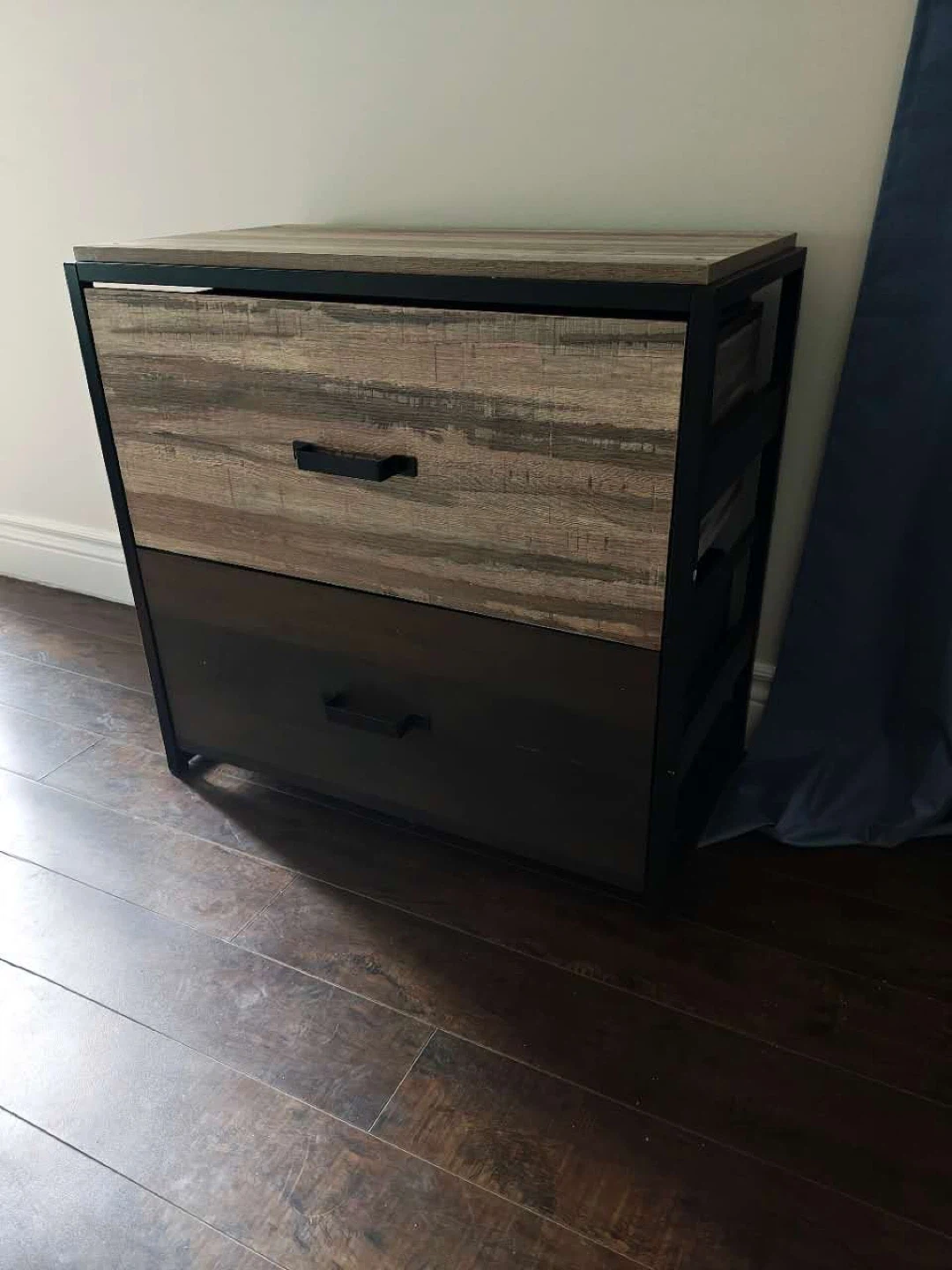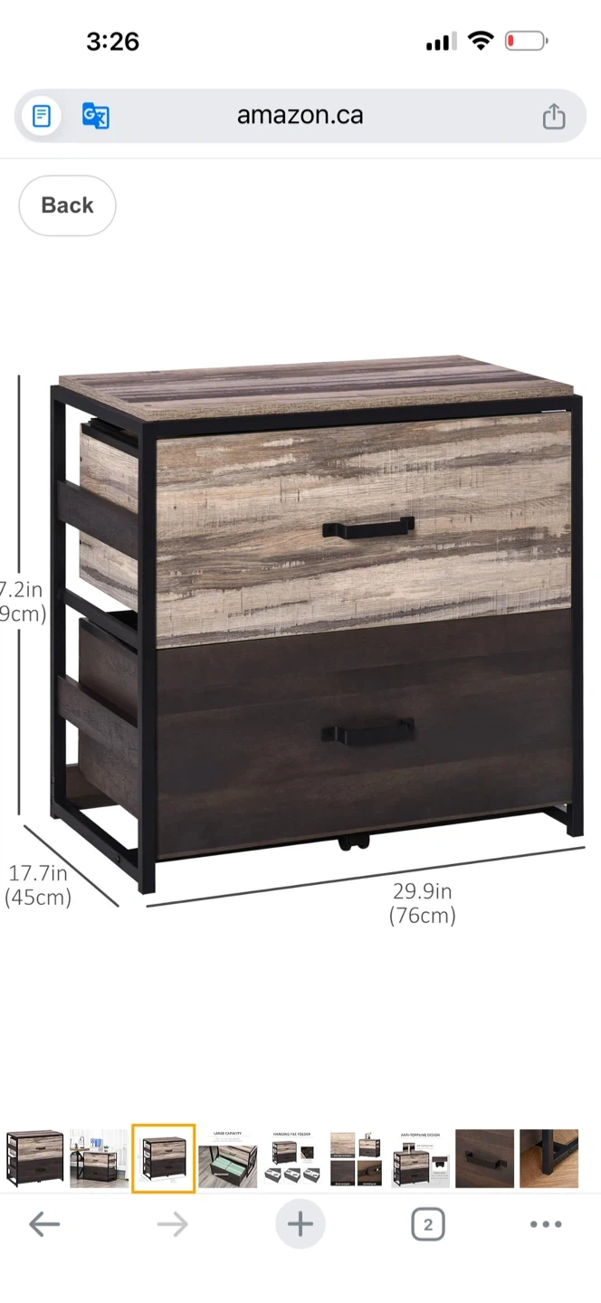 This filing cabinet features a rustic wood grain finish with a black metal frame. It includes two drawers for storage. Dimensions are 29.9 inches wide, 17.7 inches deep, and 27.2 inches high. It's a great addition for home or office organization!