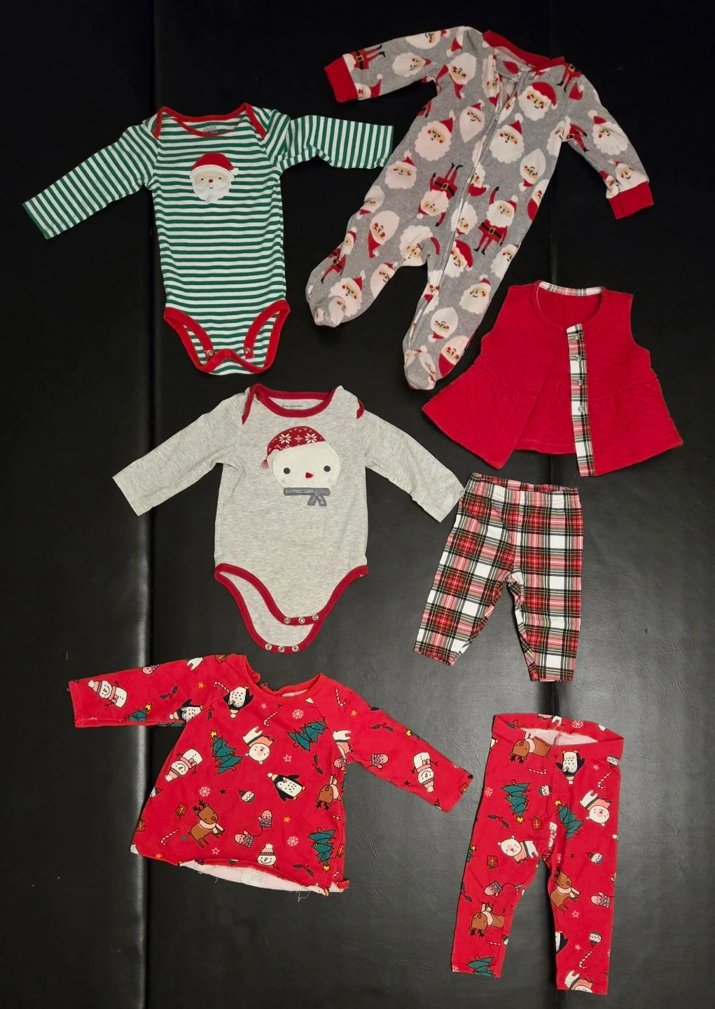 A cute little bundle of Christmas-themed baby clothes! Includes onesies and a festive outfit. Sizes range from 3-6 months to 6-9 months. Perfect for the holiday season!