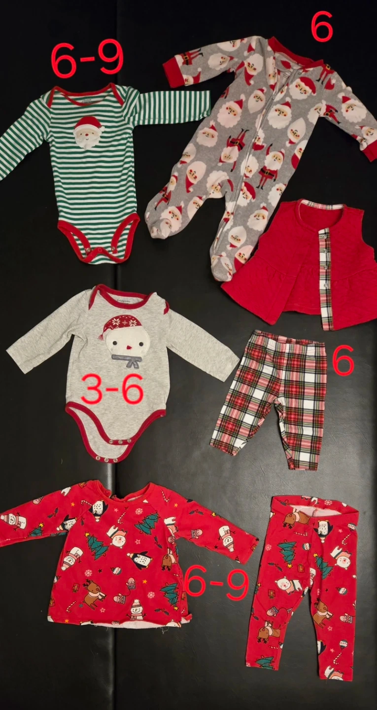 A cute little bundle of Christmas-themed baby clothes! Includes onesies and a festive outfit. Sizes range from 3-6 months to 6-9 months. Perfect for the holiday season!