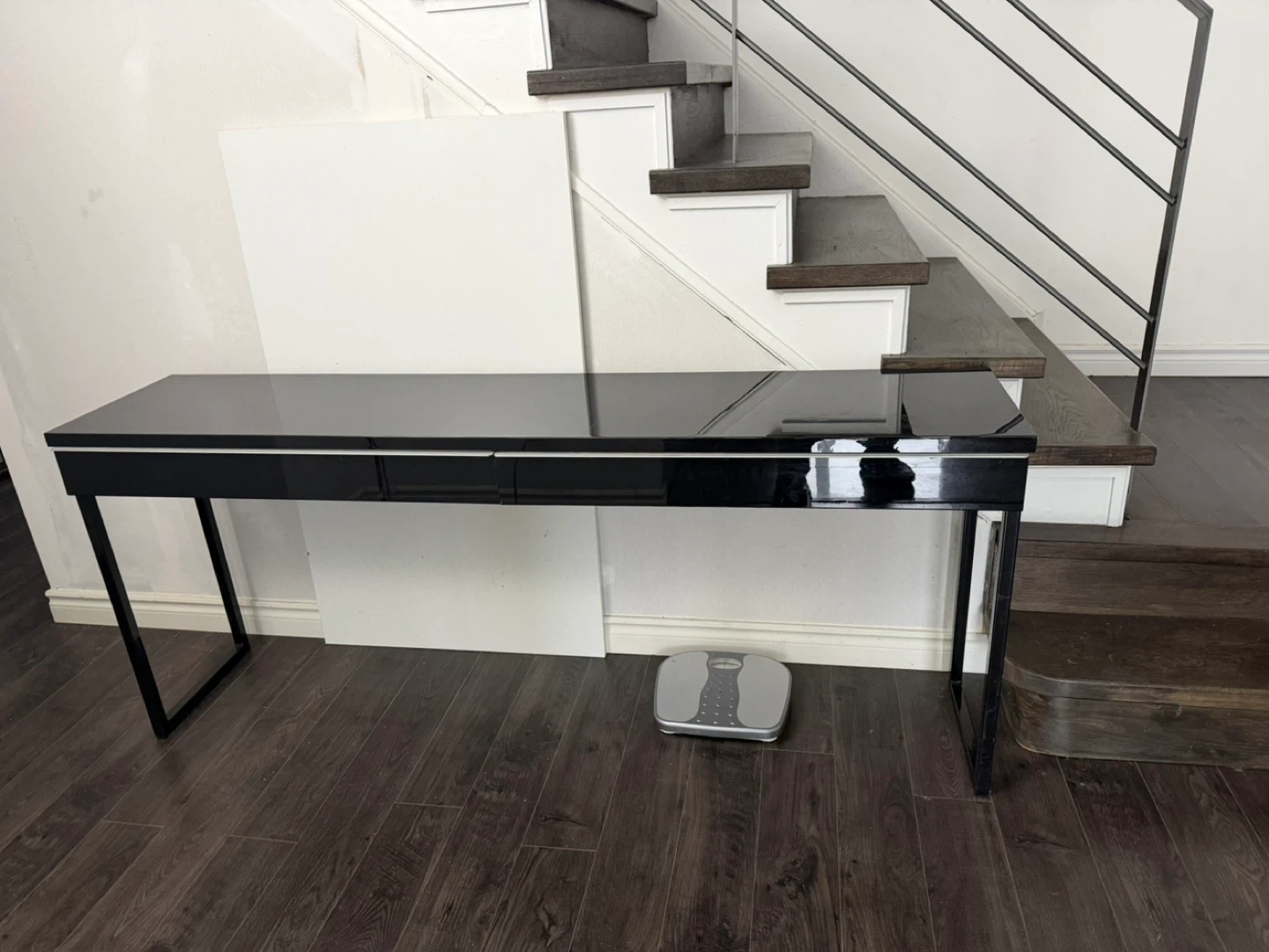 Sleek black console table with a high-gloss finish. It features two drawers for storage. The table has a modern design with a black metal frame. Its slim profile makes it a great accent piece.