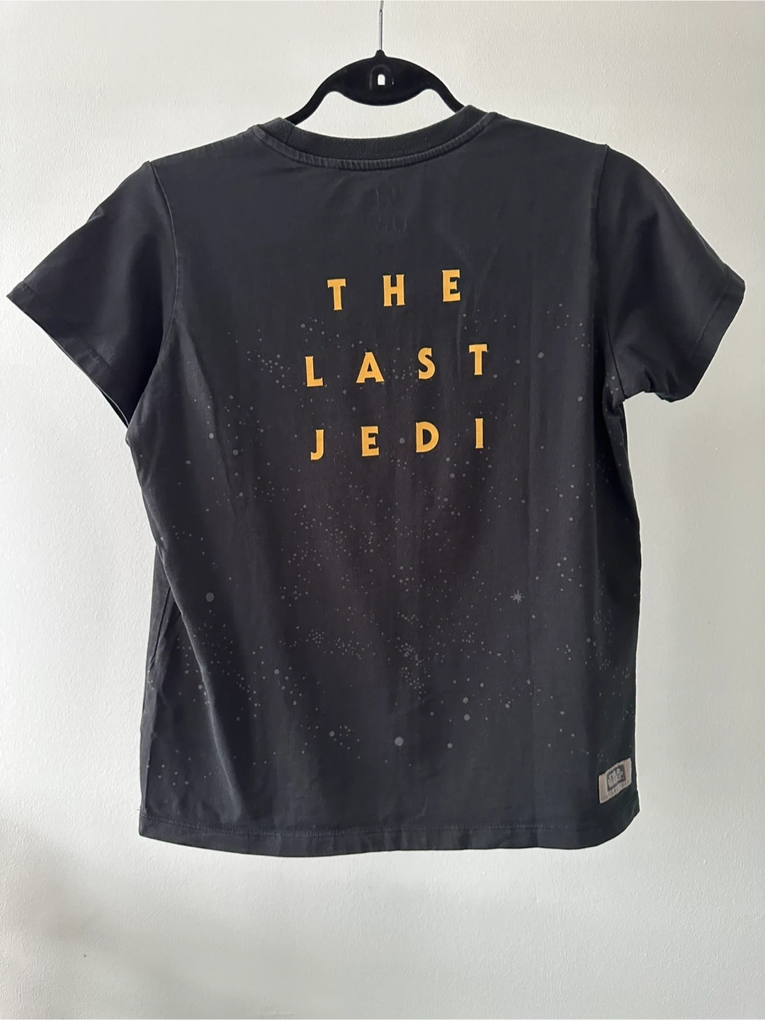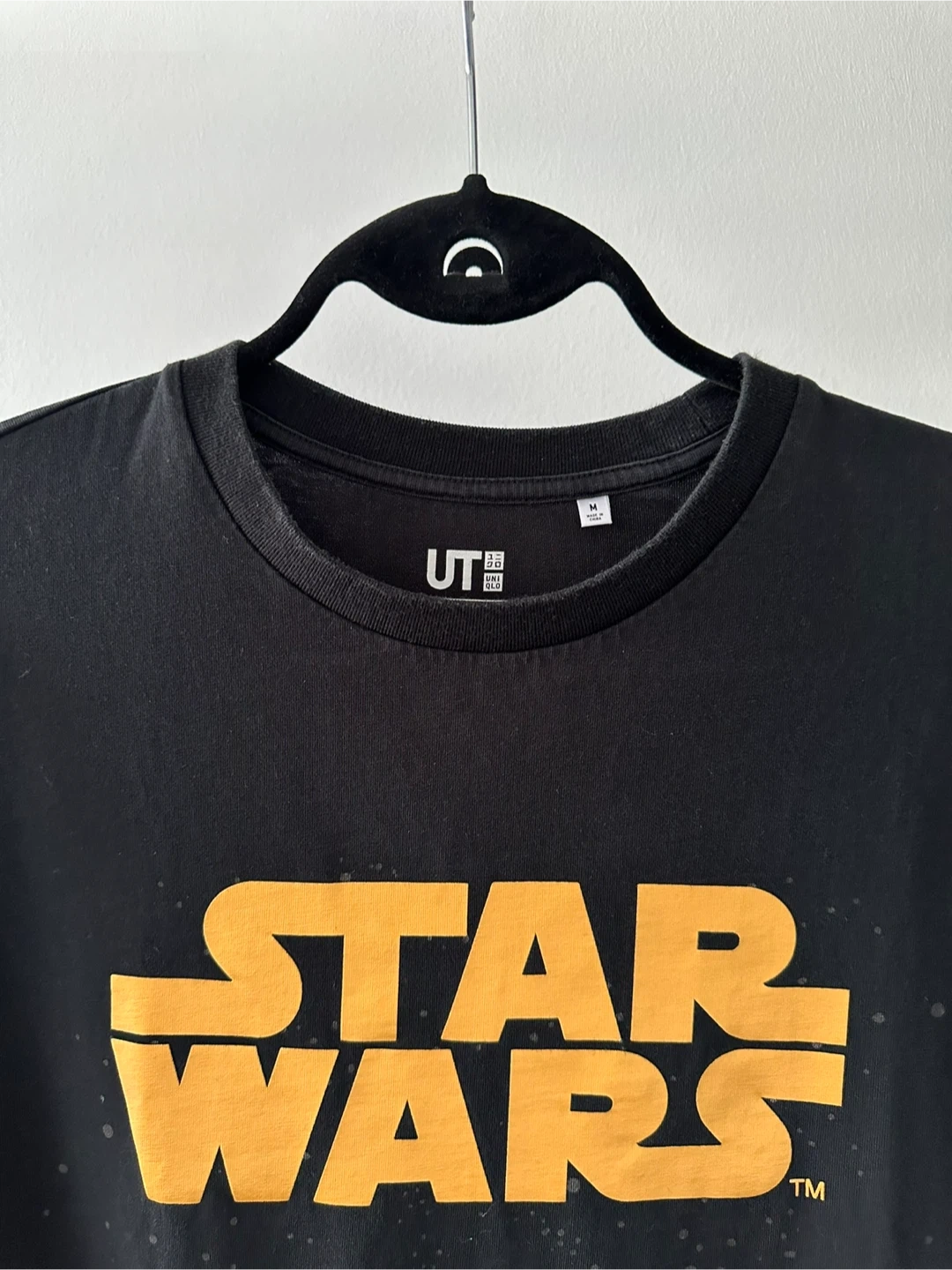 Black Uniqlo UT t-shirt featuring the Star Wars "The Last Jedi" graphic on the back and the "Star Wars" logo on the front. It's a size medium. This tee's perfect for any Star Wars fan!