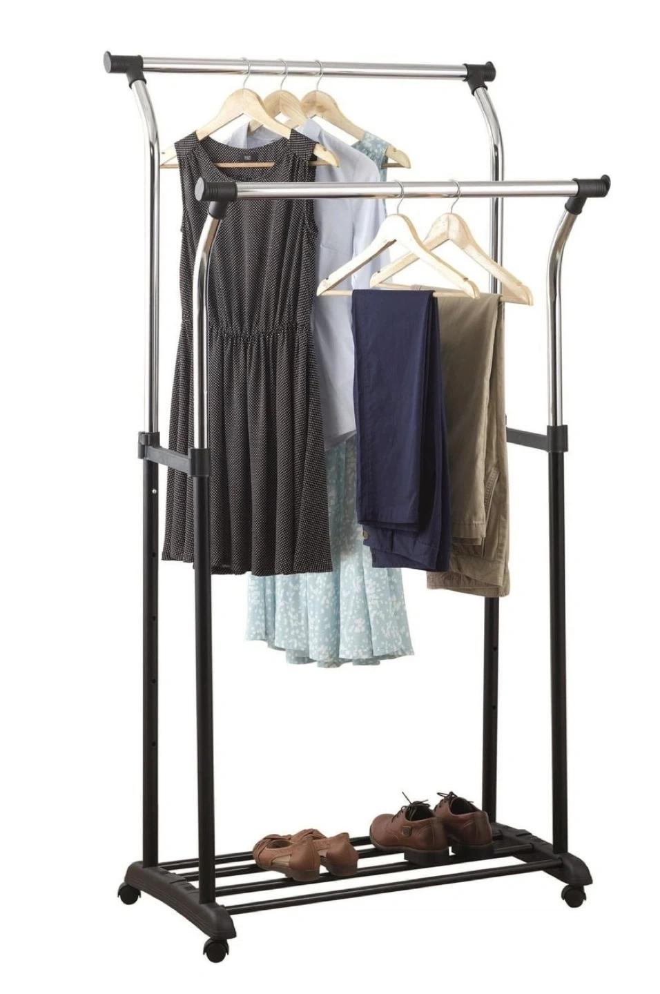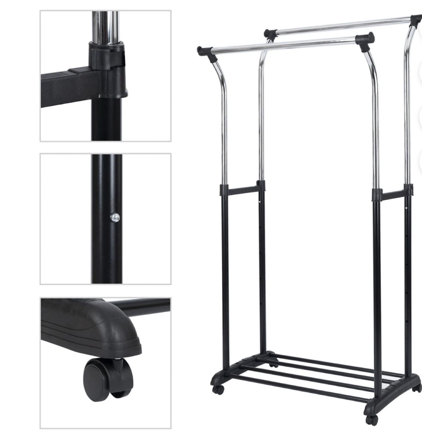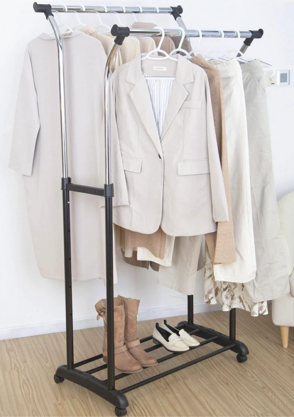 This double garment rack offers ample hanging space for clothes and accessories. It's constructed with durable metal poles and a sturdy base, and features wheels for easy mobility. Includes a bottom shelf for shoes or storage boxes.