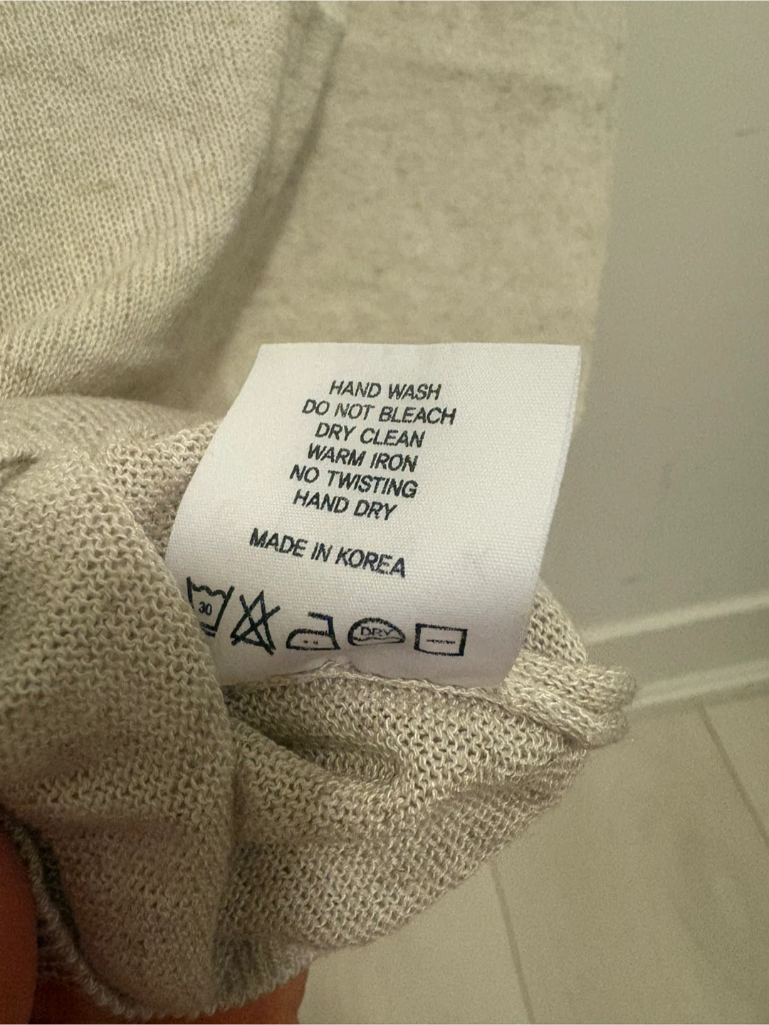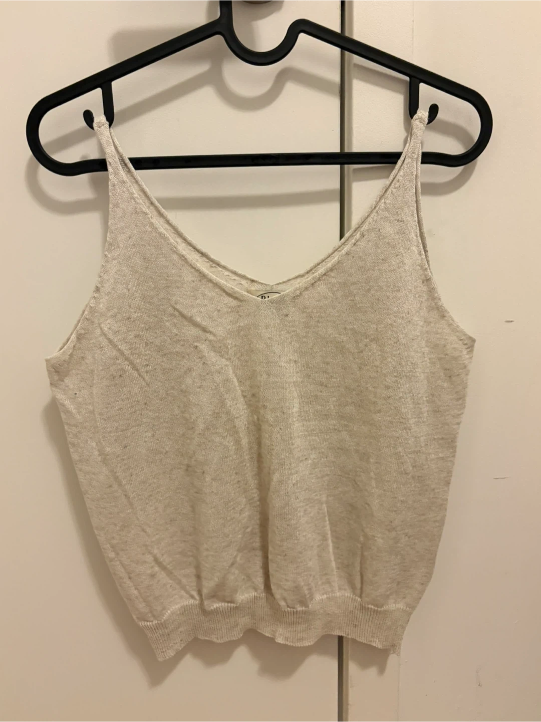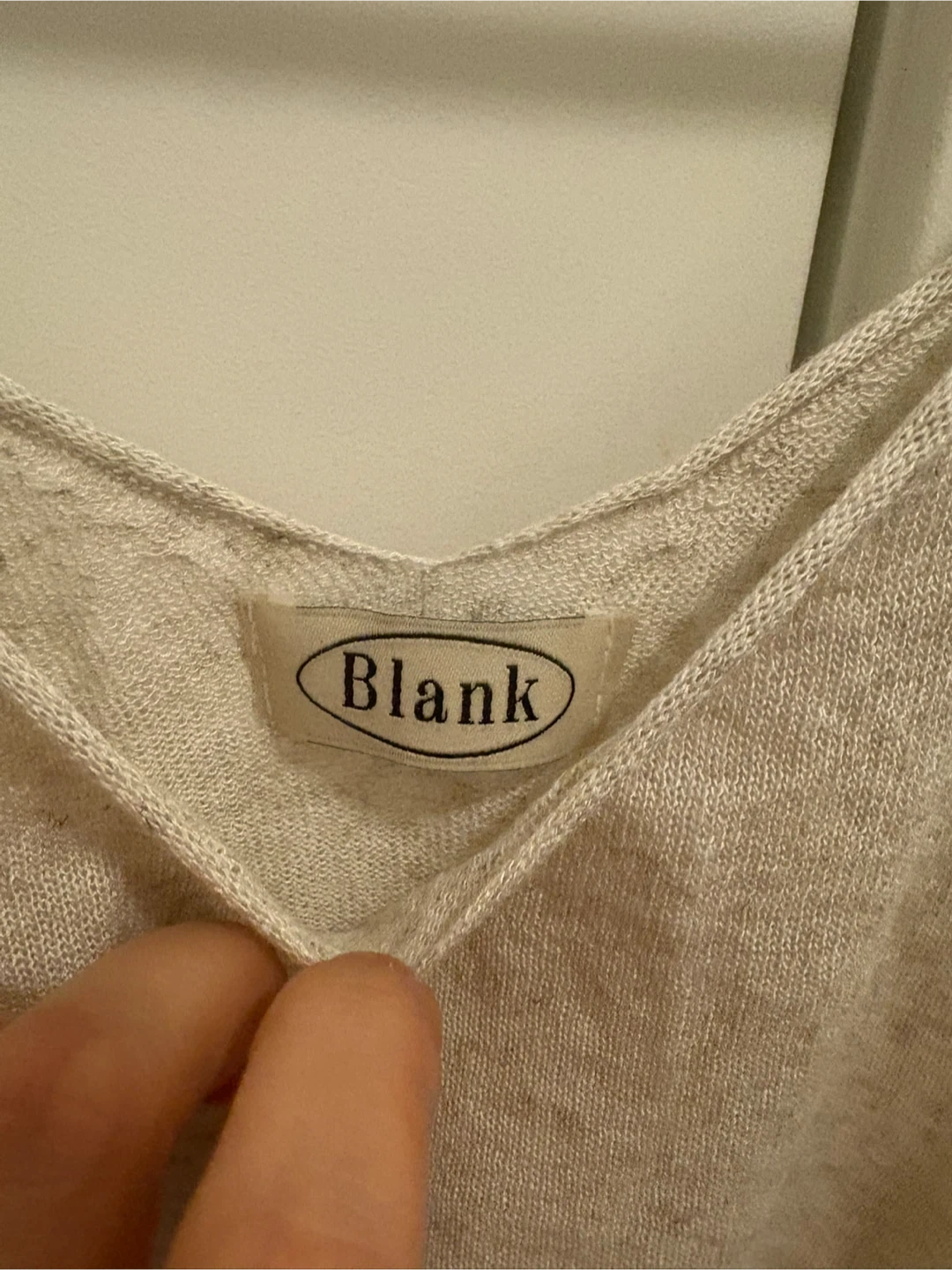 Selling a cute knit tank top from the brand Blank. It's a light beige colour, perfect for layering or wearing on its own during warmer weather. The tag indicates it should be hand washed, not bleached, and can be dry cleaned or warm ironed. Made in Korea