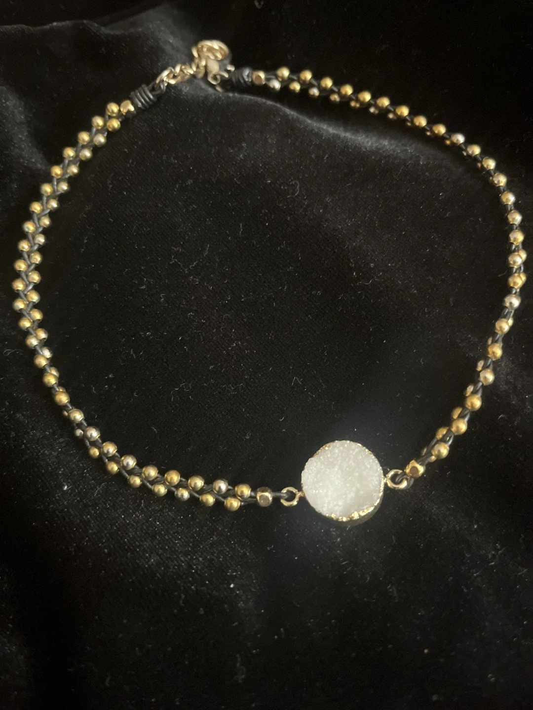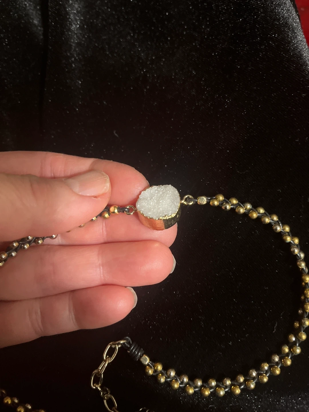 This necklace features a double strand of small gold and silver beads. A white druzy stone pendant is the centerpiece. It's approximately 18 inches long and closes with a lobster clasp. Perfect for adding a touch of sparkle to any outfit!