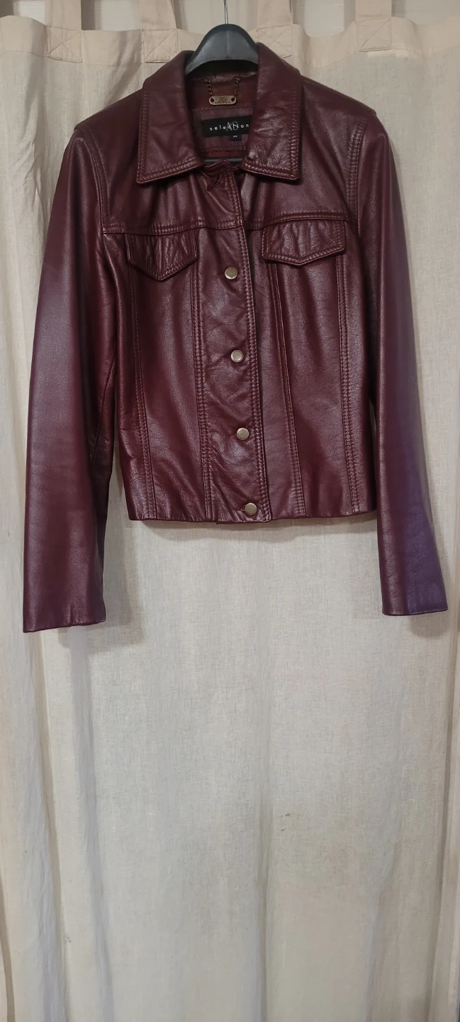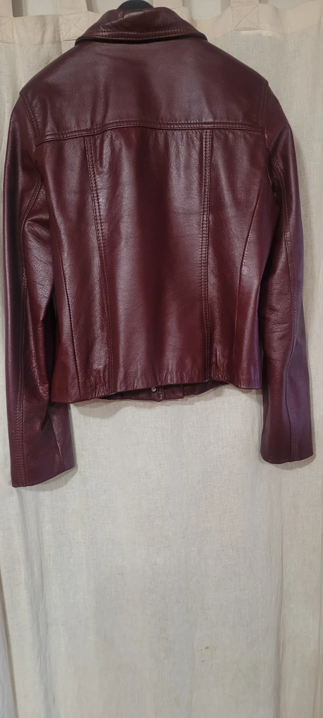 114Here's a stylish burgundy leather jacket! This jacket is perfect for adding a touch of sophistication to any outfit. It features a classic design with a button-up front and a comfortable fit, imitation front chest pockets. A great addition to your wardrobe!