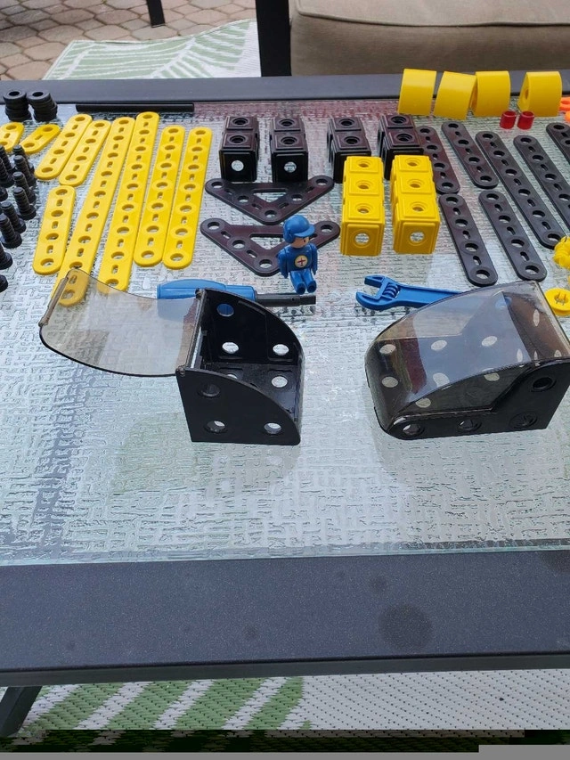For sale, a 1990's era Meccano Junior City Set #5850 Seaplane building set. I don't have a parts list, so I can't confirm if it's complete, though it appears mostly so. Includes the manual for building the seaplane and other optional builds. Selling as a parts bag only. Original instruction manual is included, but no original box or packaging. Recommended for ages 5-8. Please note, as shown in the photo, there are two damaged pieces: the black one is broken in two, and a piece is missing from the yellow connector. A complete version of the yellow piece is included for comparison. Stored in a smoke-free environment. Available for pickup only in the Whites Rd / Strouds Ln area of Pickering. Cash accepted.