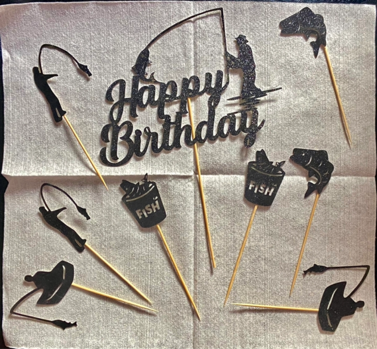 Black glitter fishing-themed cake toppers. Set includes Happy Birthday banner, fishermen, fish, and fishing buckets. Perfect for a fishing-themed birthday party.