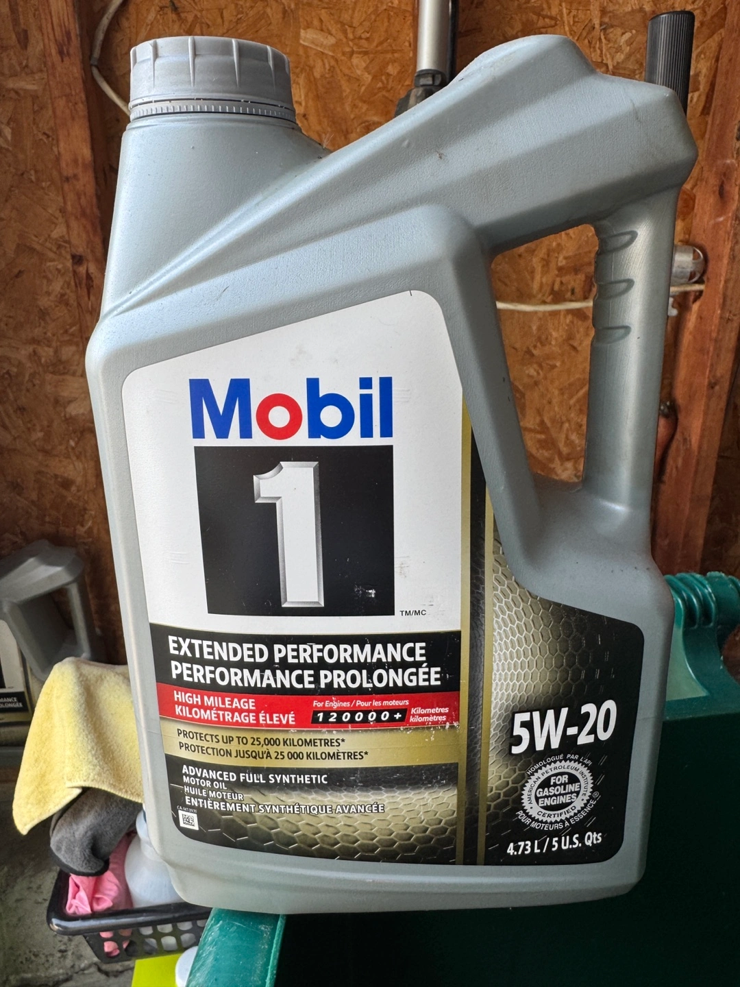 Up for grabs Mobil 1 Extended Mileage 5W-20 advanced full synthetic motor oil. It provides extended performance and protection for high mileage vehicles. The jug contains around 4 liters.