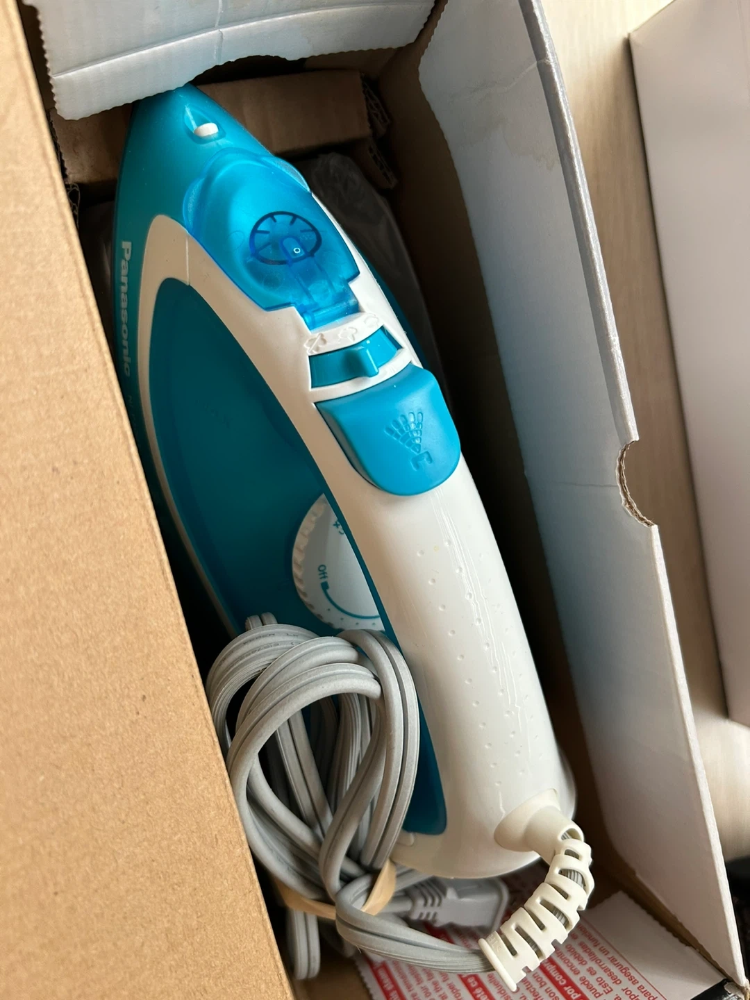 This is a Panasonic NI-P300T steam iron in blue and white. It's a 1500W iron with a durable soleplate. It comes with its original box.