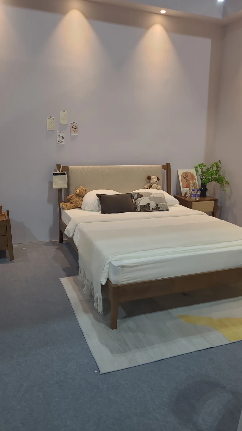 A stylish wooden bed frame featuring a comfortable upholstered headboard. It's made with a solid wood construction and comes with a light beige fabric headboard. This bed frame offers a clean and modern look for any bedroom.