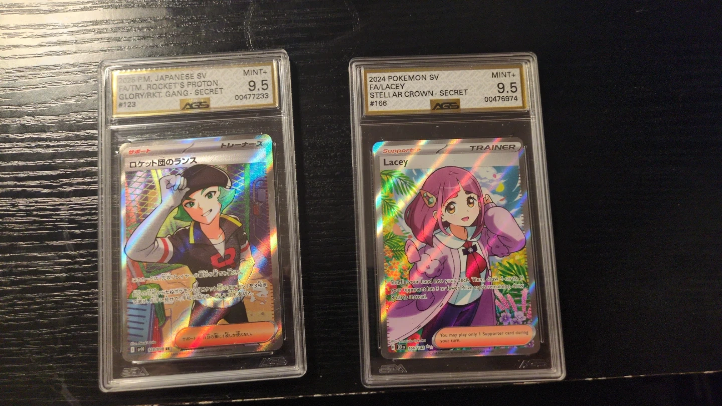 These are two graded Pokemon trading cards. One is a 2024 Pokemon SV Stellar Crown Secret card featuring Lacey. The other is a 2025 Japanese SV Fat! Rocket's Proton Glory card. Both have a grading of MINT+ 9.5 from AGS.
