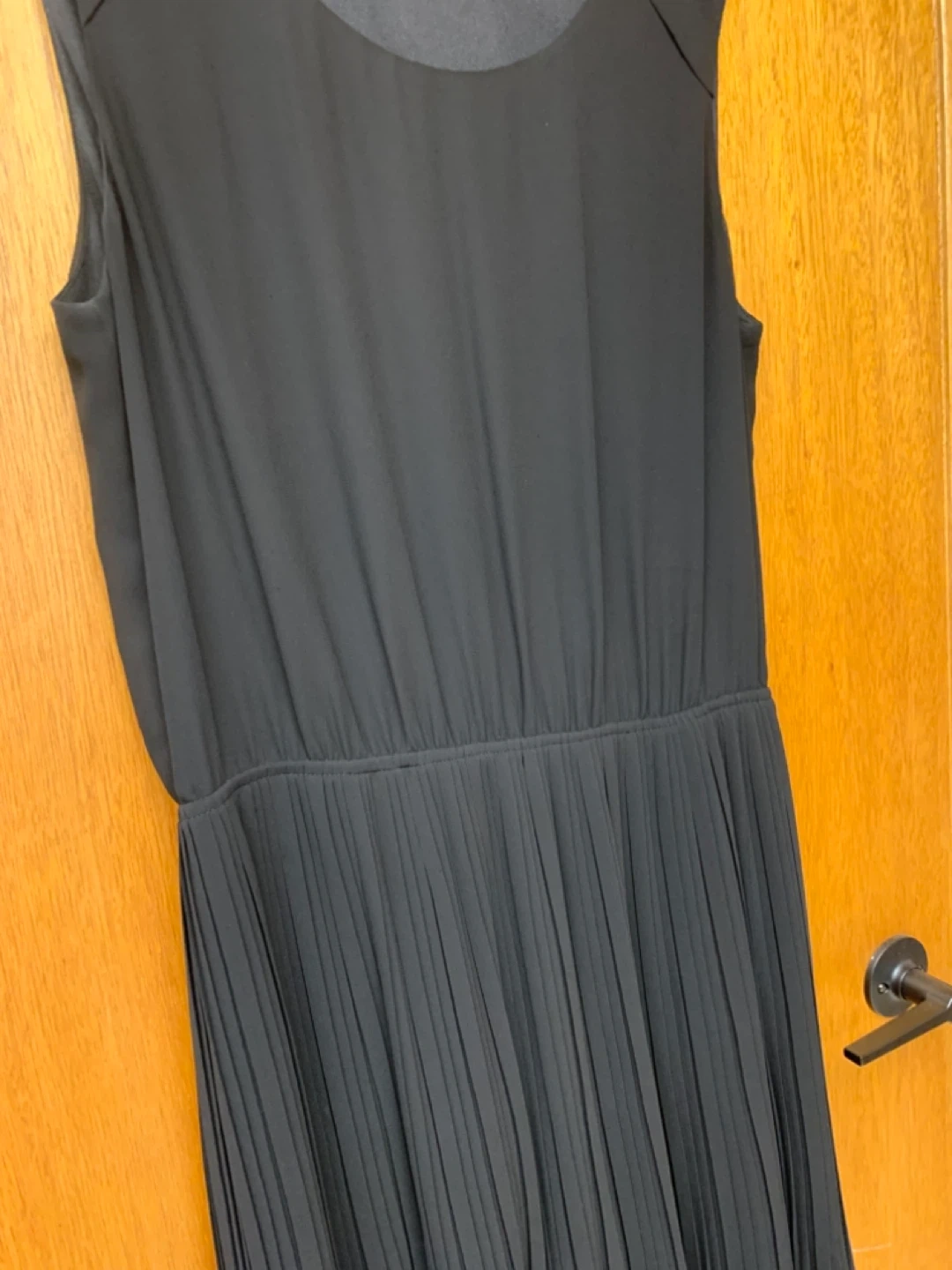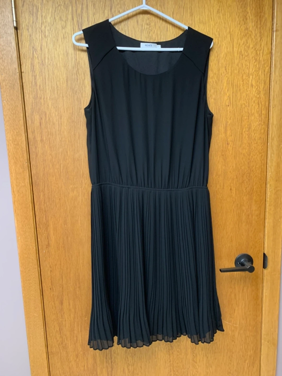 This RICKI'S black sleeveless dress features a shirred waist and a pleated skirt. It's a size 10. A classic black dress for many occasions!