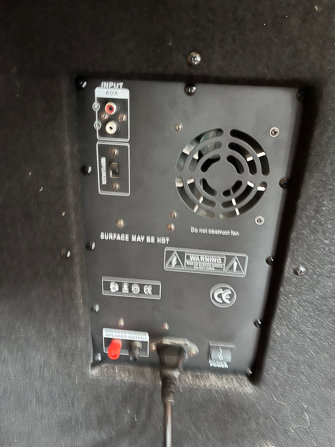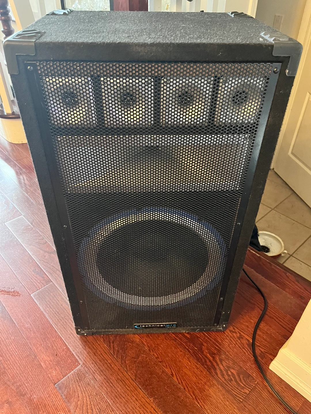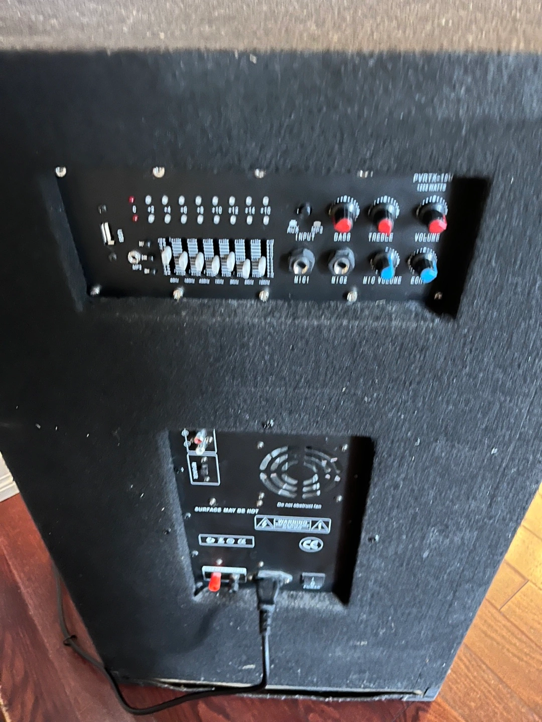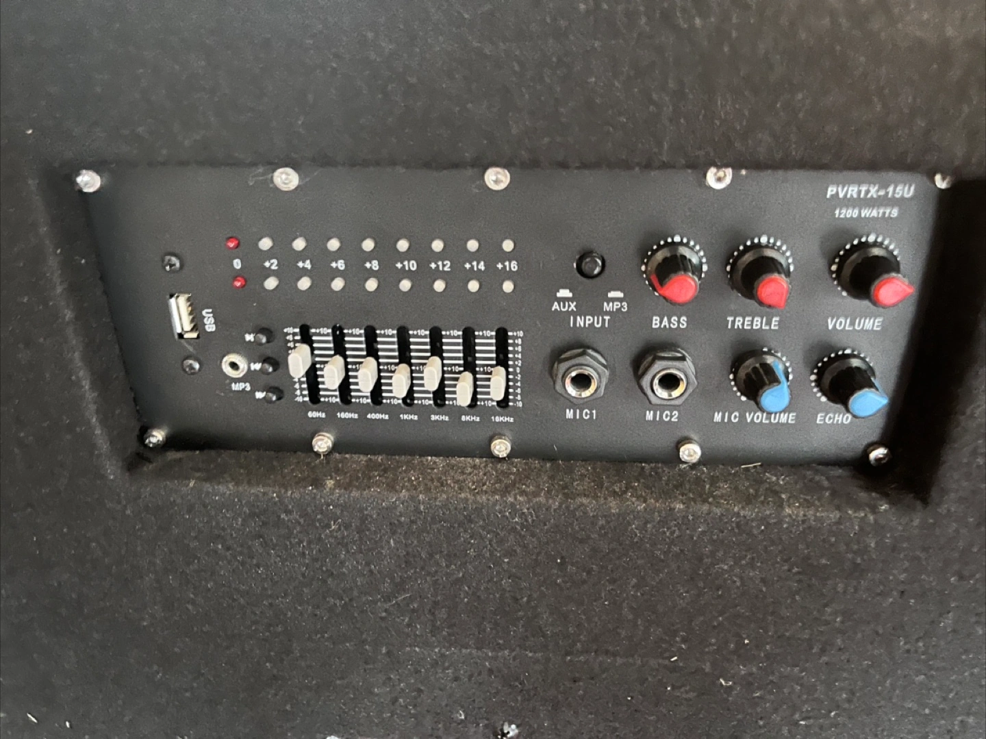 Powerful 15-inch powered PA speaker. Features multiple inputs, including AUX, MP3, and microphone. EQ controls and volume adjustments. 1200 watts.