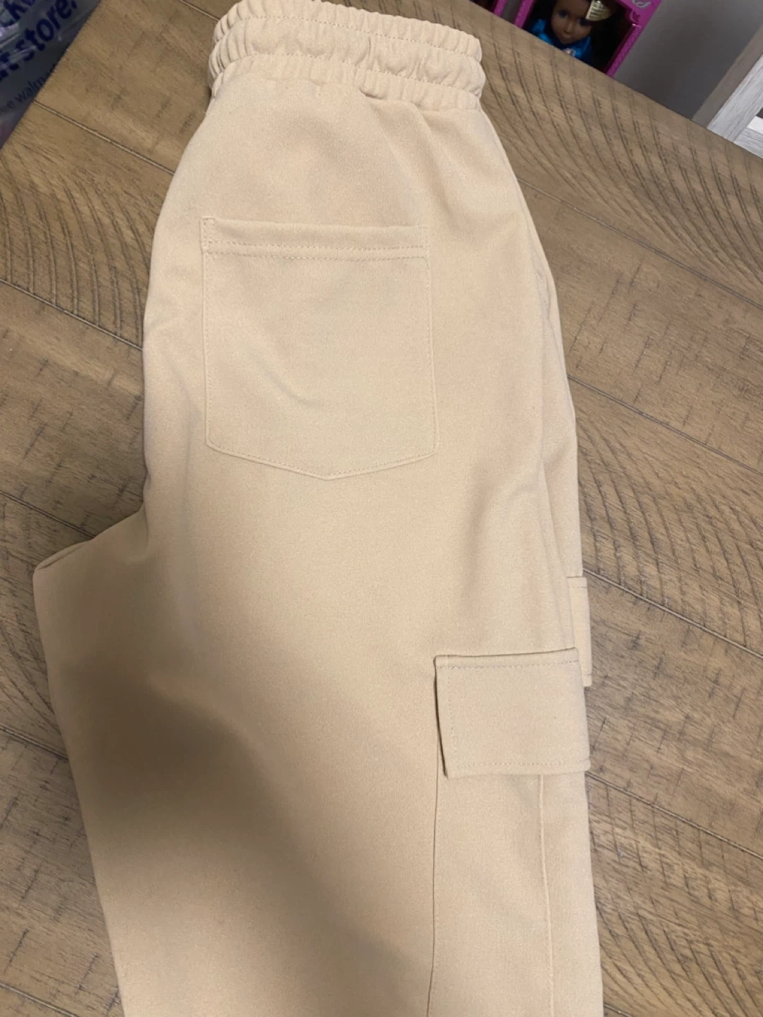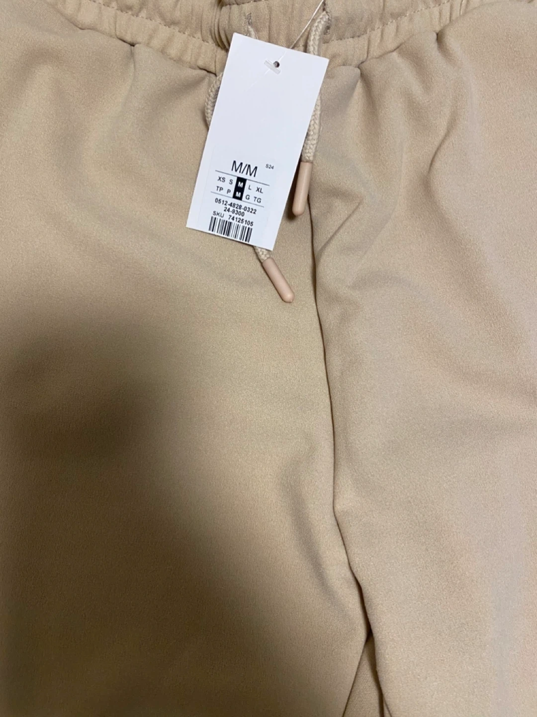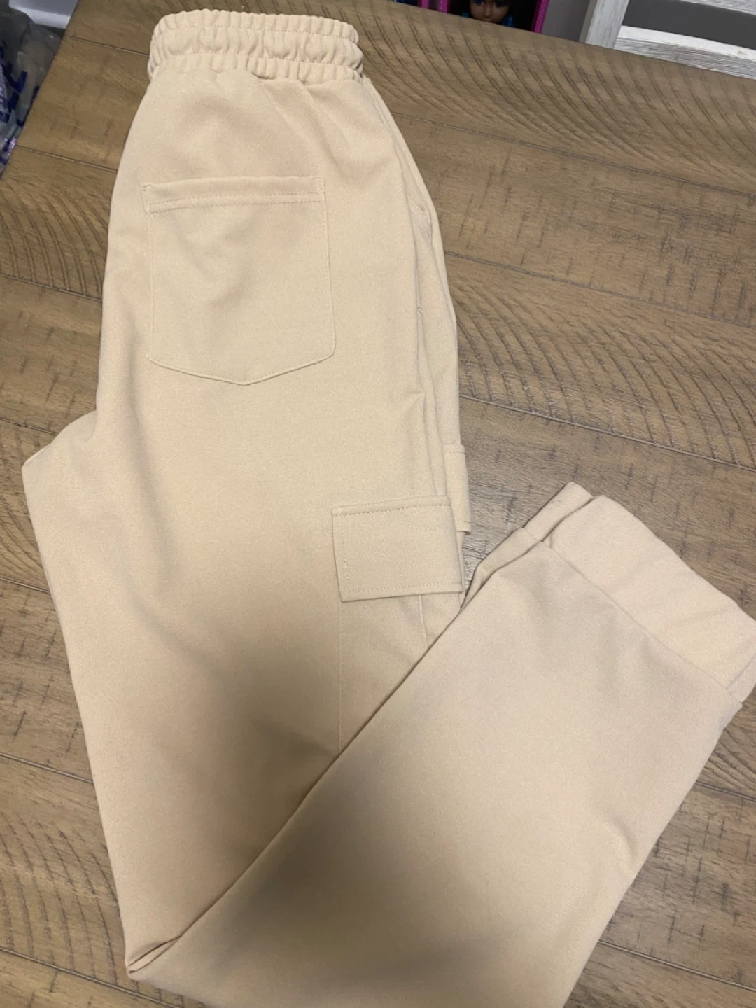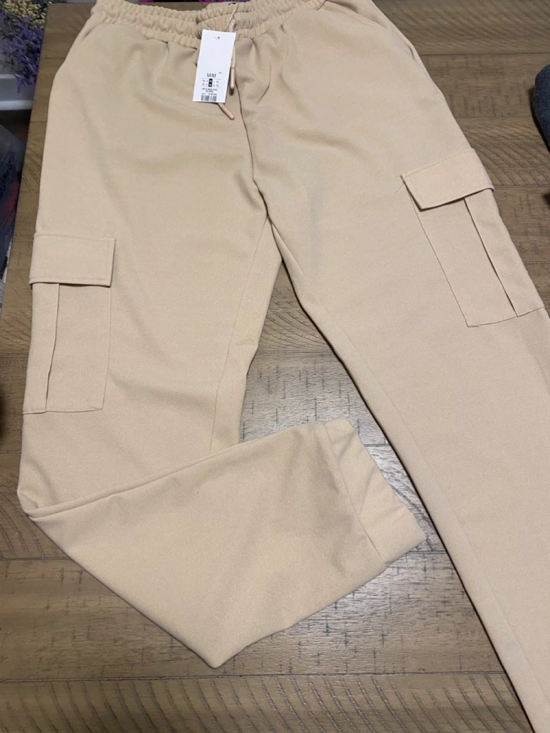 Beige cargo pants with a drawstring waist. They have two front pockets and two cargo pockets on the legs. Size is M/M.