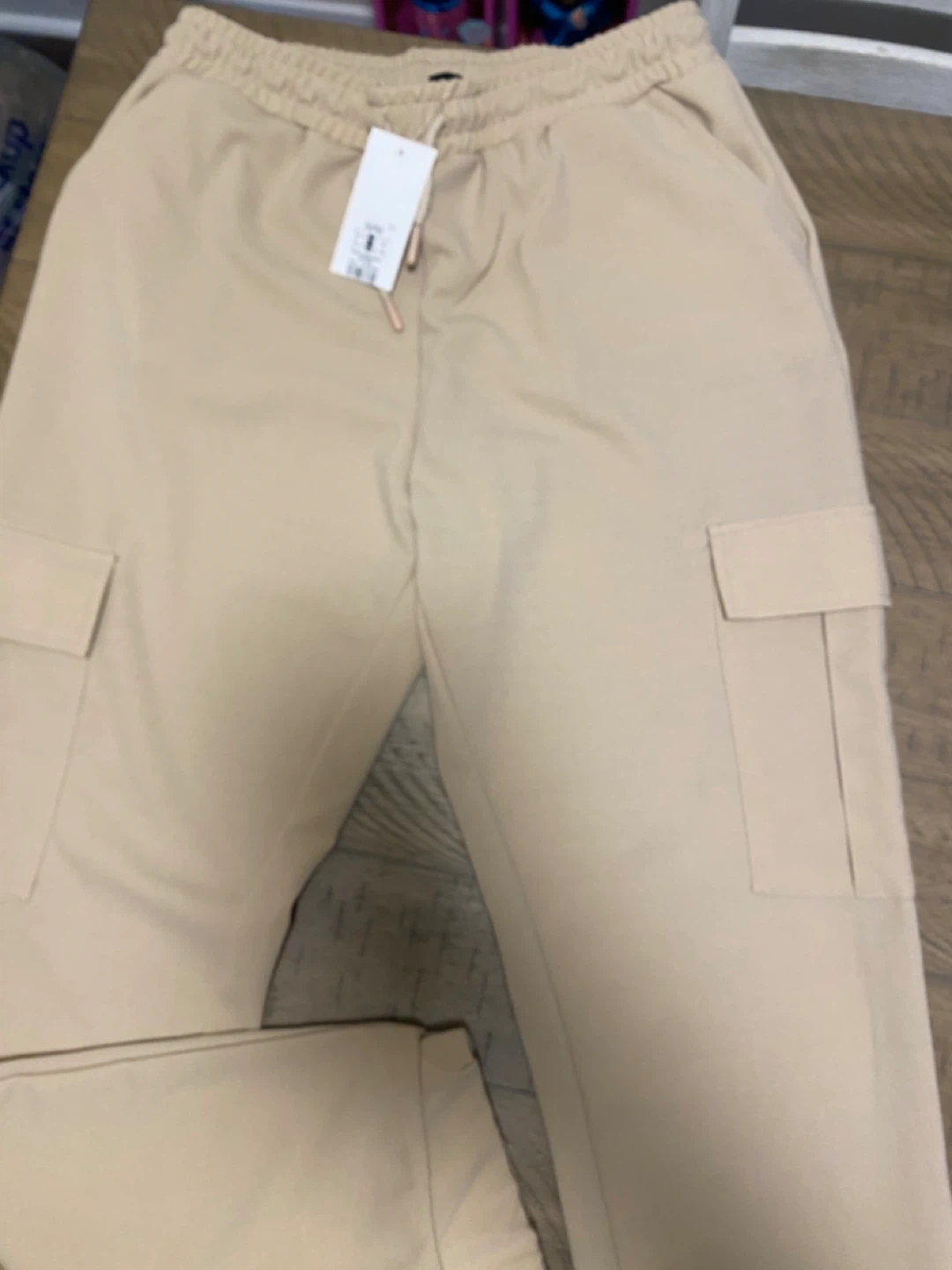 Beige cargo pants with a drawstring waist. They have two front pockets and two cargo pockets on the legs. Size is M/M.