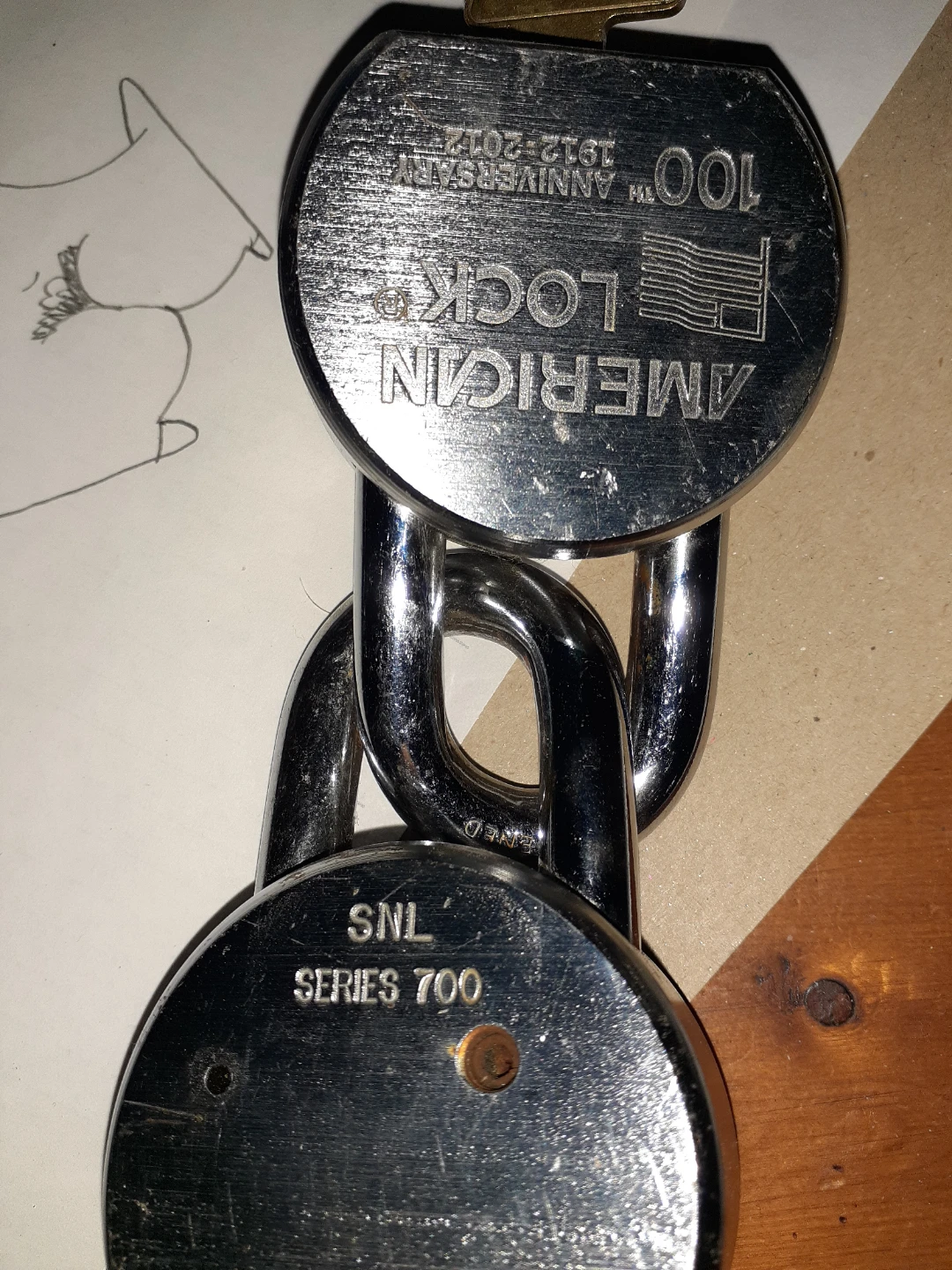 American Lock 100th Anniversary padlock, celebrating 1912-2012. This is a SNL Series 700 model. It's made of durable metal and features a heavy-duty chain. This padlock is suitable for securing various items.