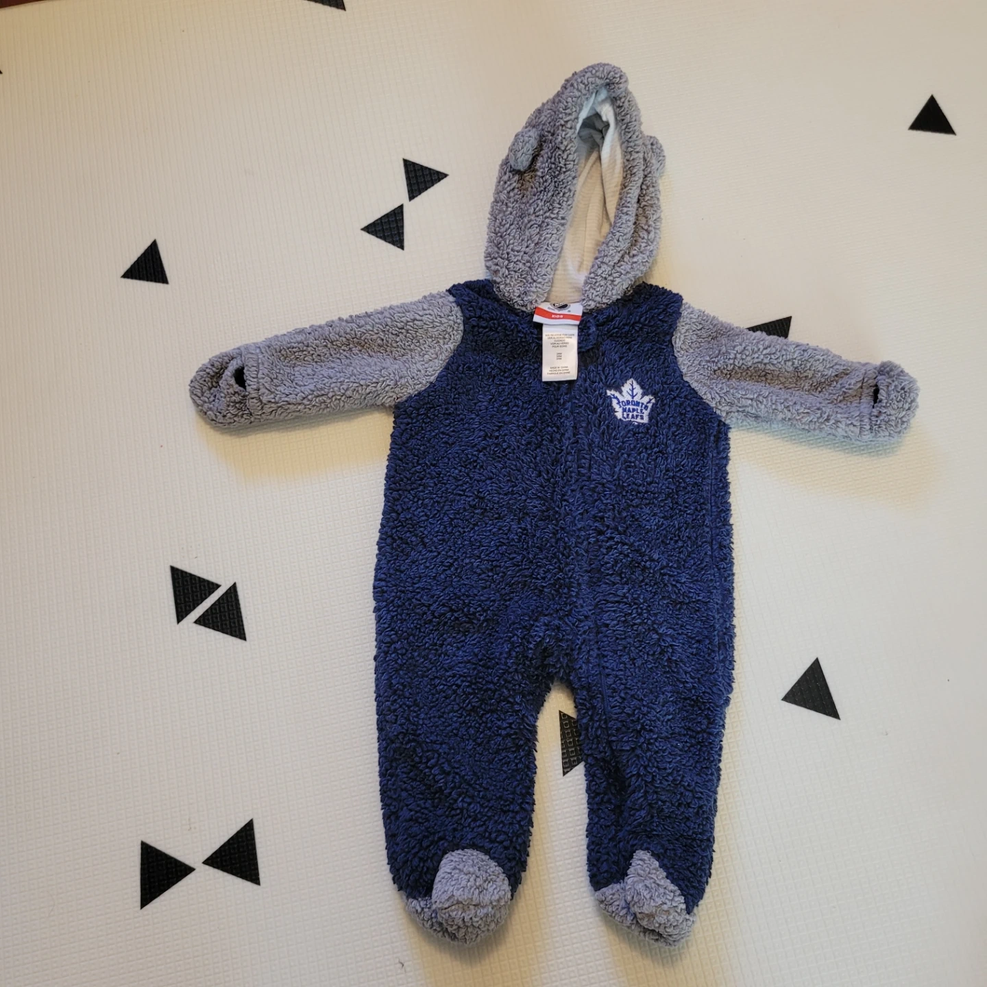 Used, but very good condition. No rips or stains. Has foldover mittens on the sleeves. Tag says 3/6 months but it fits big (my child grew out of it as they were wearing 6-9m clothing).