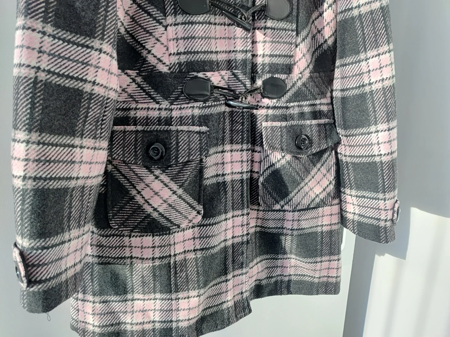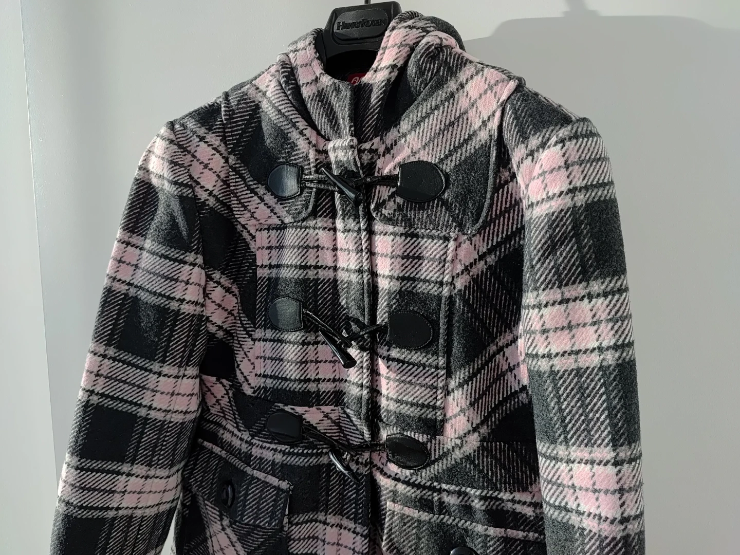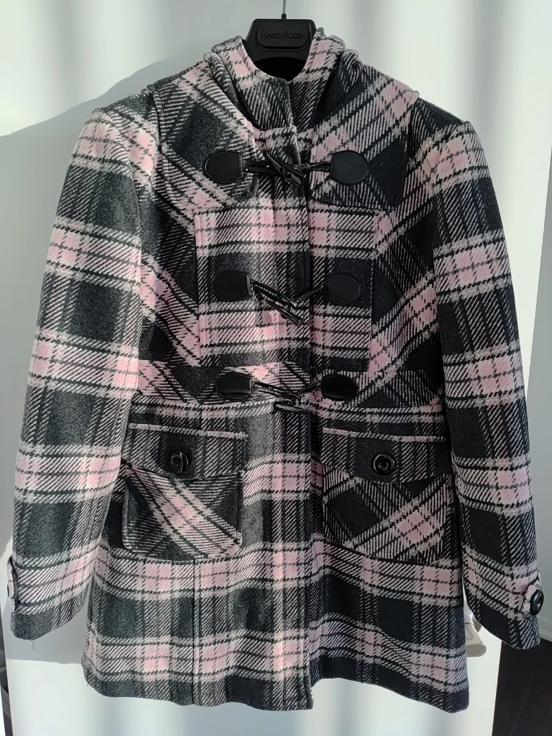 Warm hooded coat. Features a plaid pattern in shades of pink and grey. Toggle closures.
