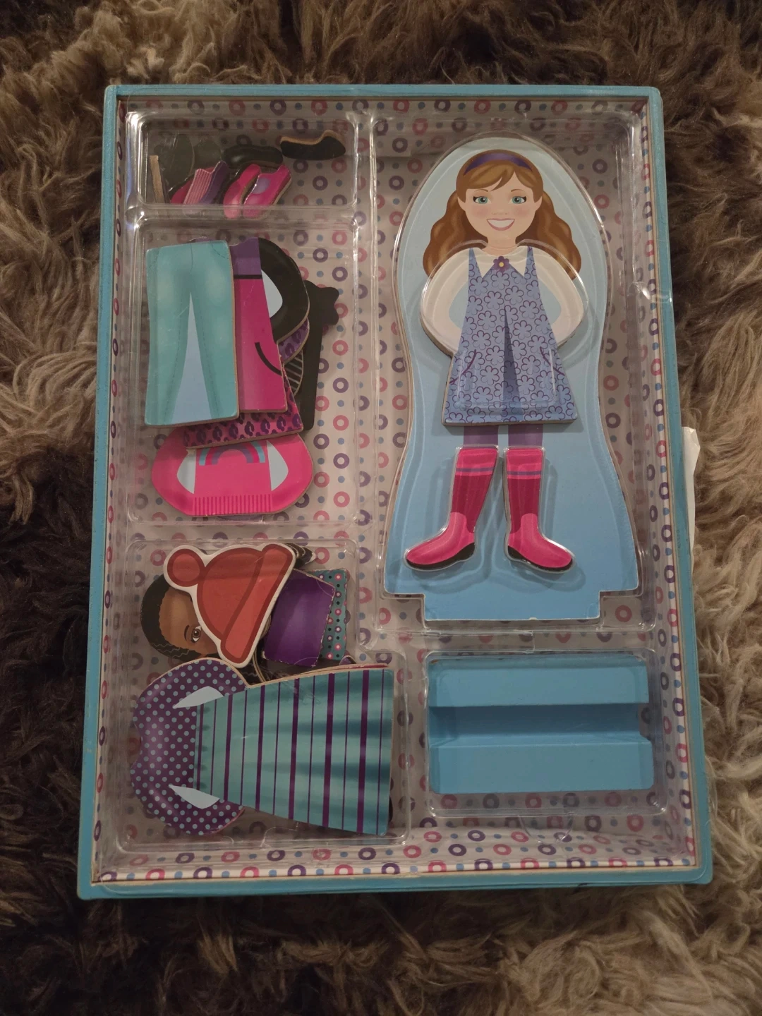 Selling a Melissa & Doug Magnetic Dress-Up Wooden Doll! It's in great condition and comes with a variety of magnetic outfits and accessories for hours of fun. The set includes the wooden doll and lots of different clothing pieces that easily attach with magnets. Perfect for creative play and developing fine motor skills. The box is included!