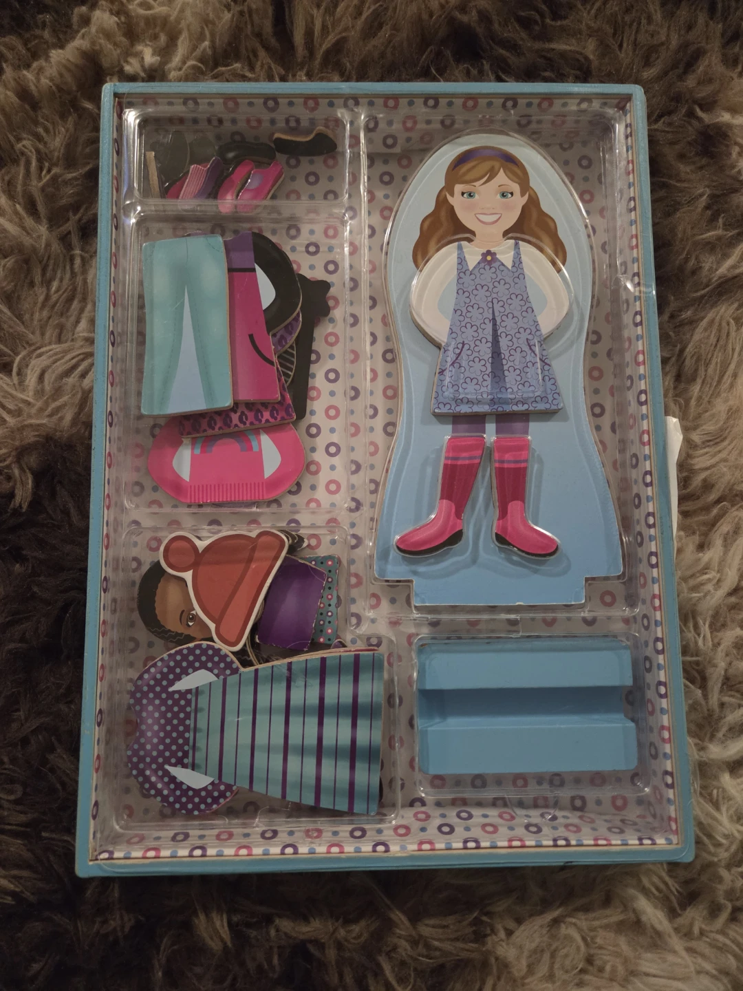 Selling a Melissa & Doug Magnetic Dress-Up Wooden Doll! It's in great condition and comes with a variety of magnetic outfits and accessories for hours of fun. The set includes the wooden doll and lots of different clothing pieces that easily attach with magnets. Perfect for creative play and developing fine motor skills. The box is included!
