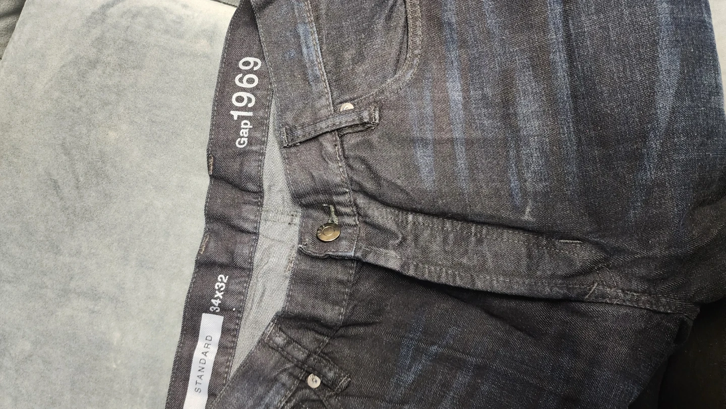 These are Gap 1969 men's jeans in a standard fit. They come in a dark wash denim with a 34x32 size. The jeans are made with a focus on waterless processing for a more sustainable approach. It's a classic look for everyday wear!