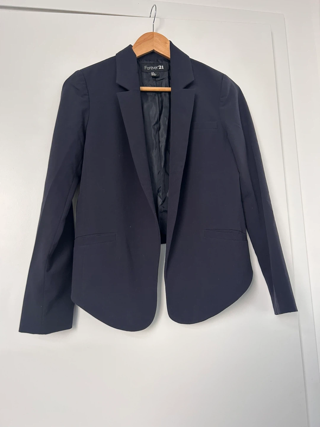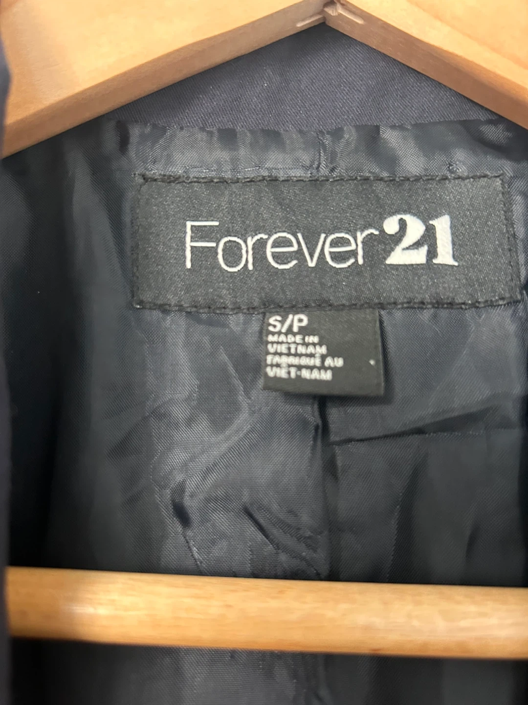 A navy blazer from Forever 21. It's a size S/P and . This jacket features a classic design.