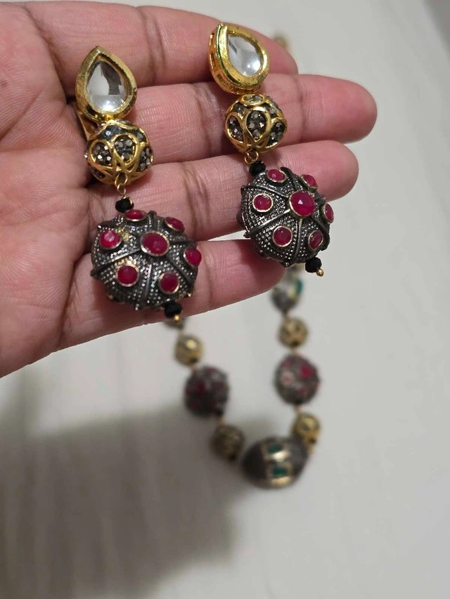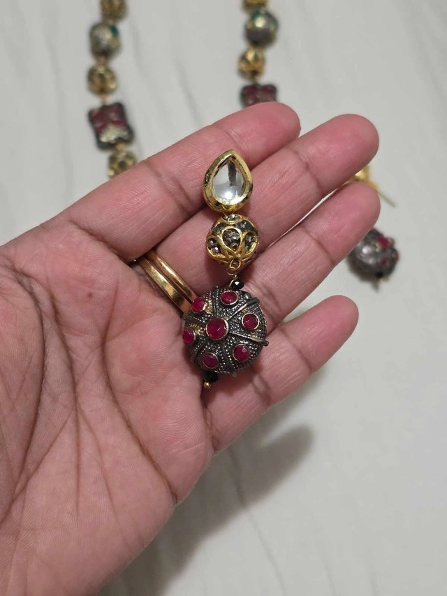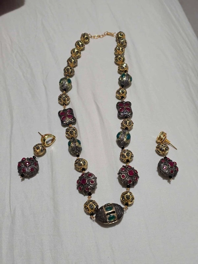This used necklace set features an ornate design with ruby and emerald-tone accents and comes with matching earrings. It's in good condition and ready to add a unique touch to your jewellery collection. If you're reading this, it's still available! Cash accepted.