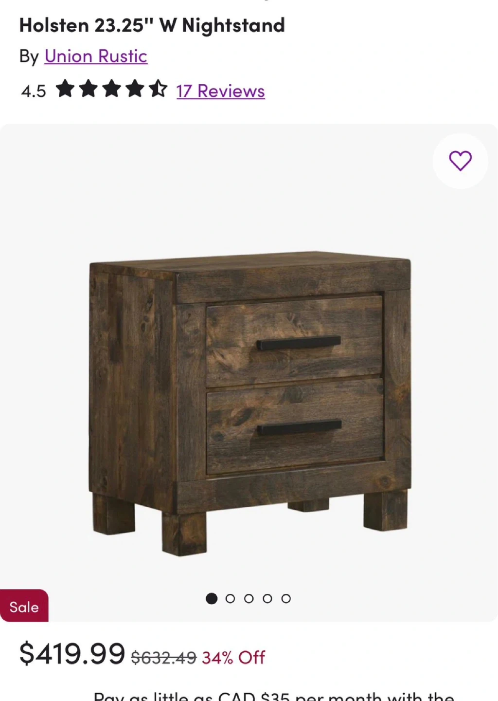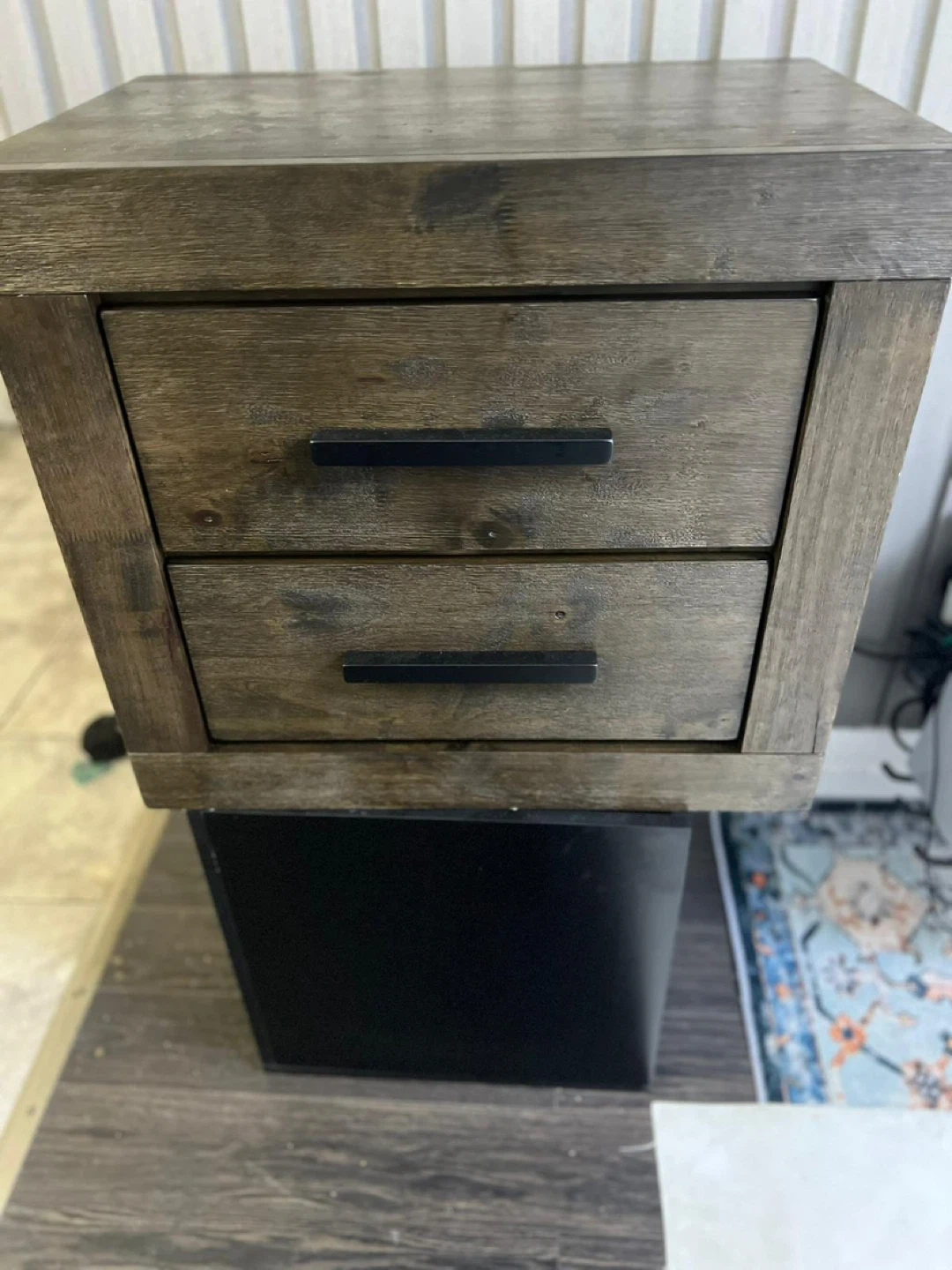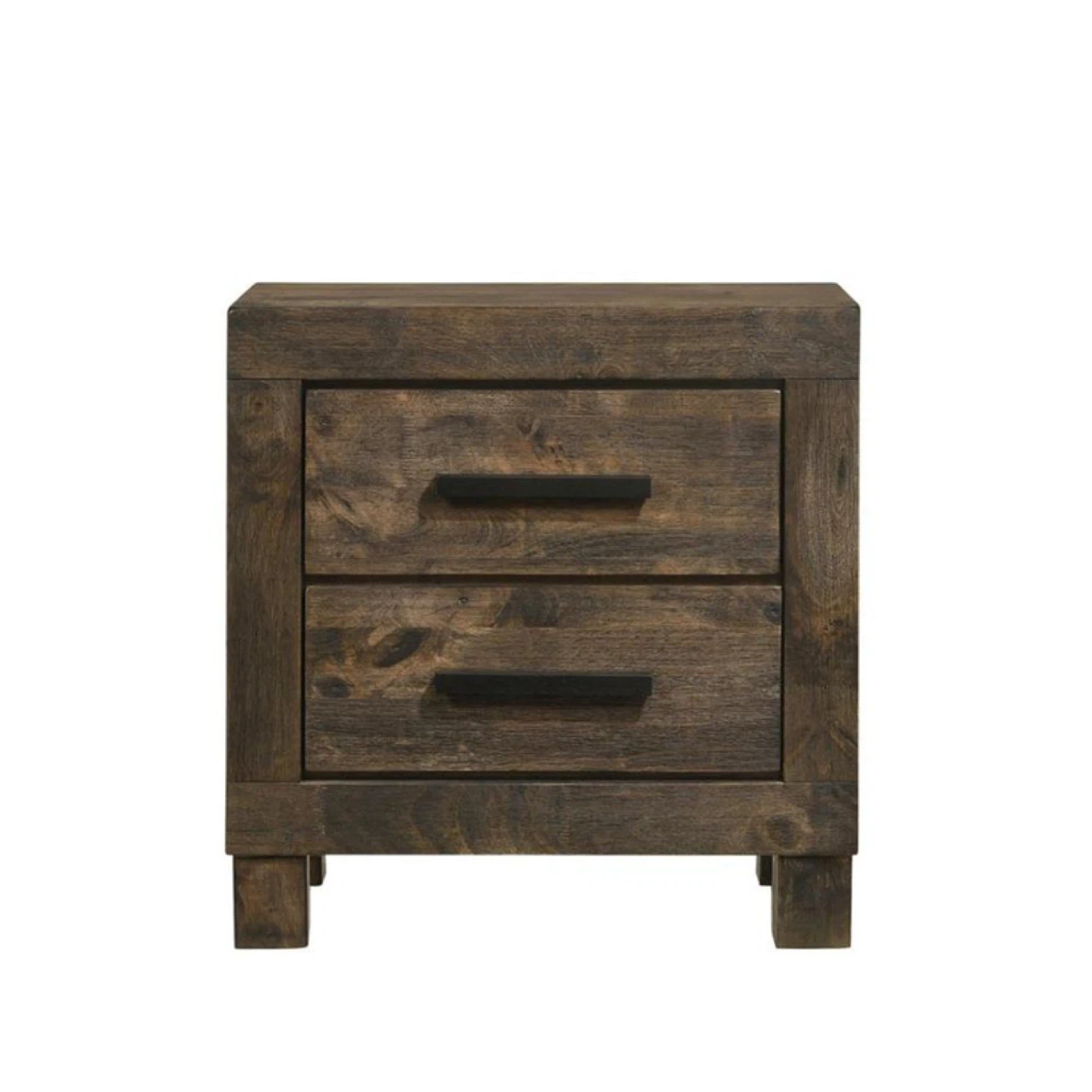 This nightstand has two drawers with black handles. It's made of wood with a dark, rustic finish. Provides convenient bedside storage.