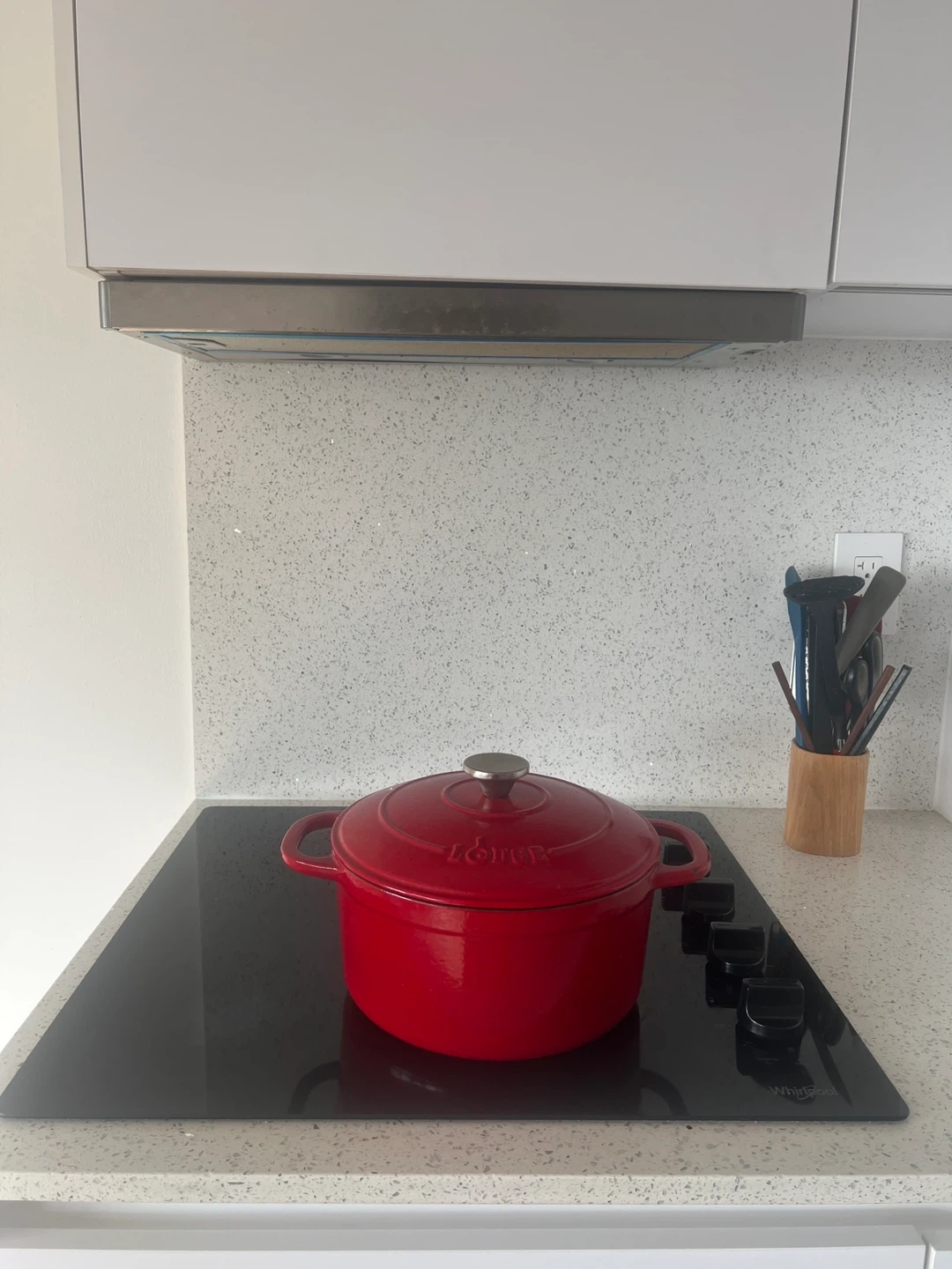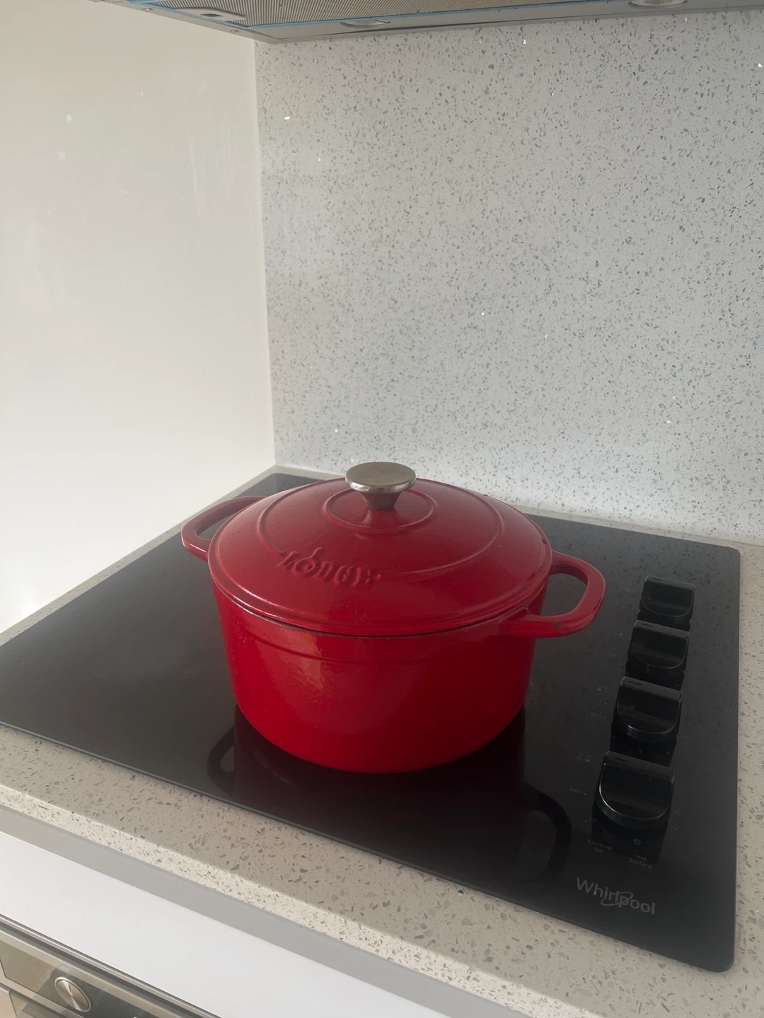 This red Lodge enamelled cast iron Dutch oven is perfect for stews and roasts. It's made of durable cast iron with an enamel coating. It has two side handles for easy carrying. A great addition to any kitchen!