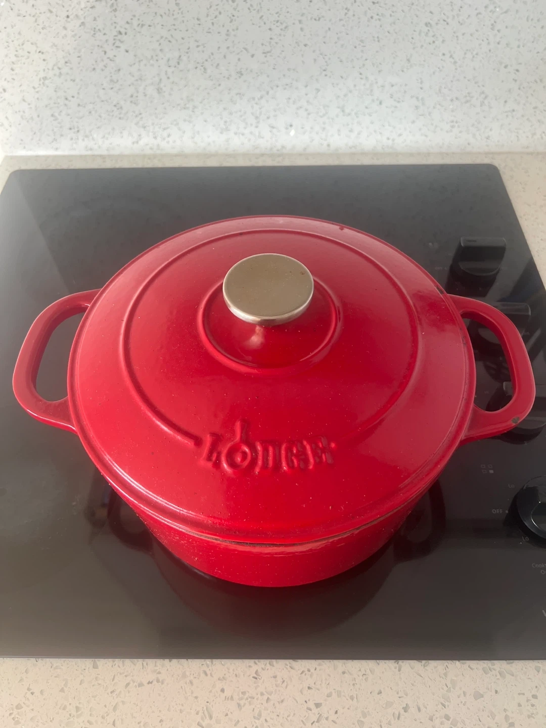 This red Lodge enamelled cast iron Dutch oven is perfect for stews and roasts. It's made of durable cast iron with an enamel coating. It has two side handles for easy carrying. A great addition to any kitchen!