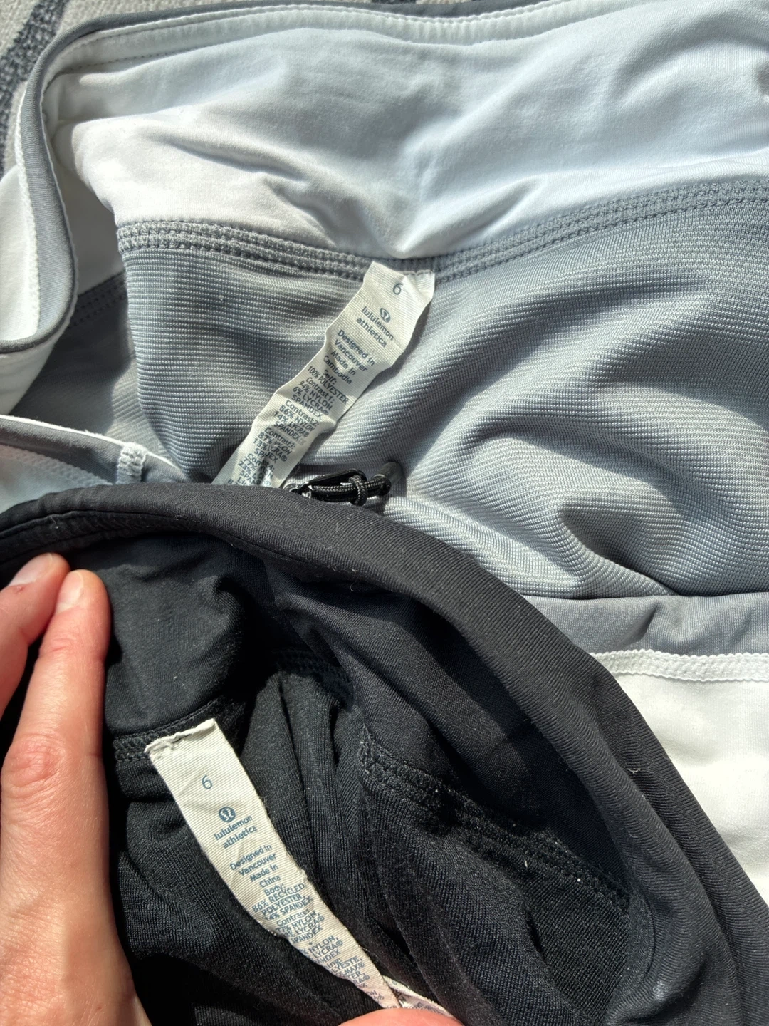 Selling a set of Lululemon running shorts in size 6. There's a mix of colours including black, olive green, and a striped grey/white. They have a small pocket in the back. They're in great condition.