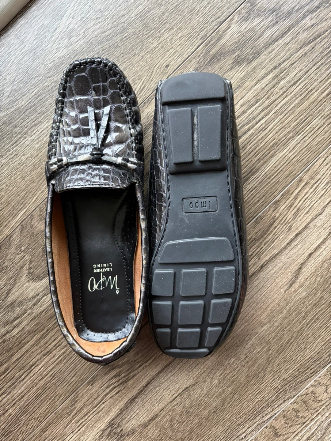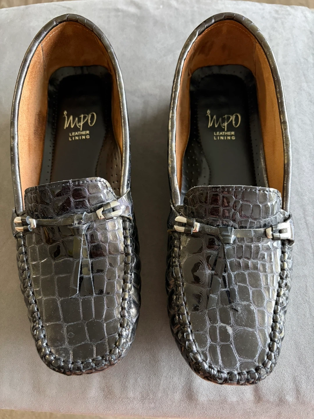 Stylish IMPO patent loafers with a faux crocodile texture. Features leather lining and a slip-on design. Perfect for adding a touch of sophistication to any outfit.