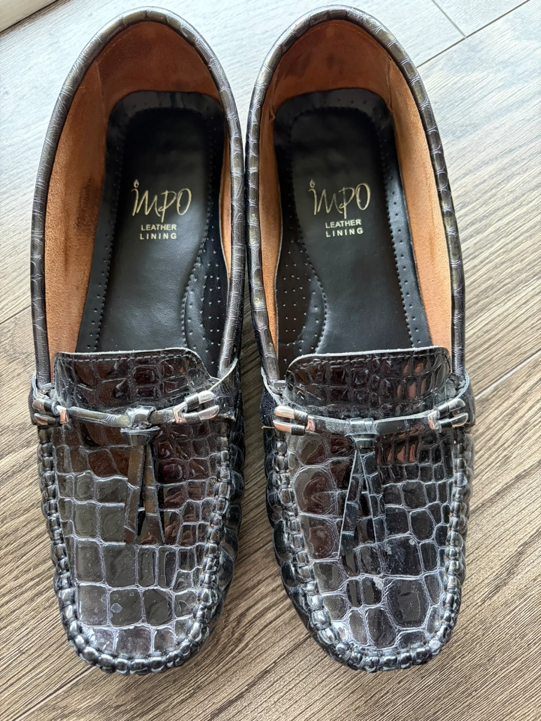 Stylish IMPO patent loafers with a faux crocodile texture. Features leather lining and a slip-on design. Perfect for adding a touch of sophistication to any outfit.