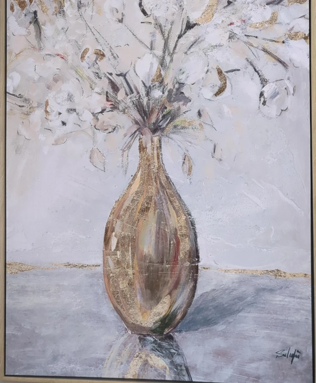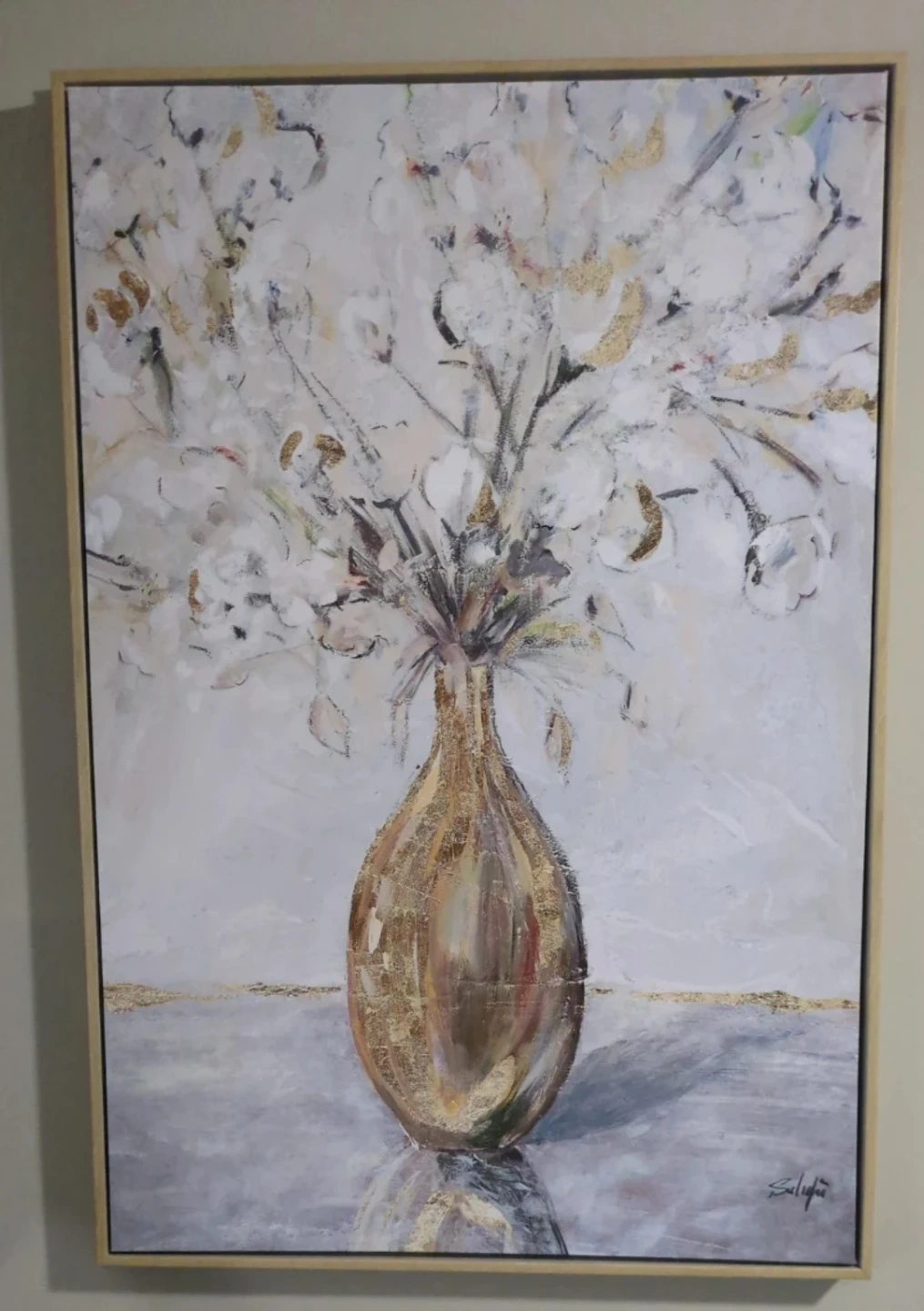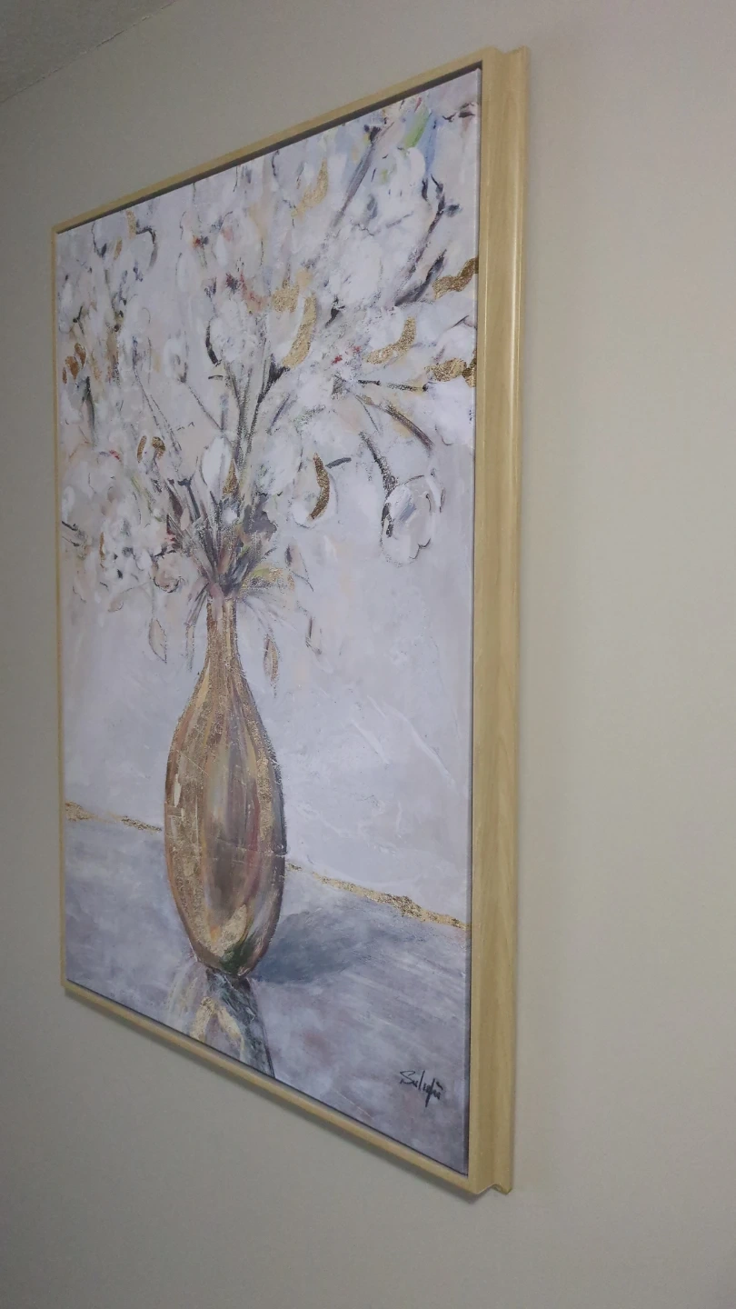 Adds a touch of elegance to any room. Features a floral design in a vase with subtle gold leaf accents. Framed with a light wood-tone border. Dimensions are