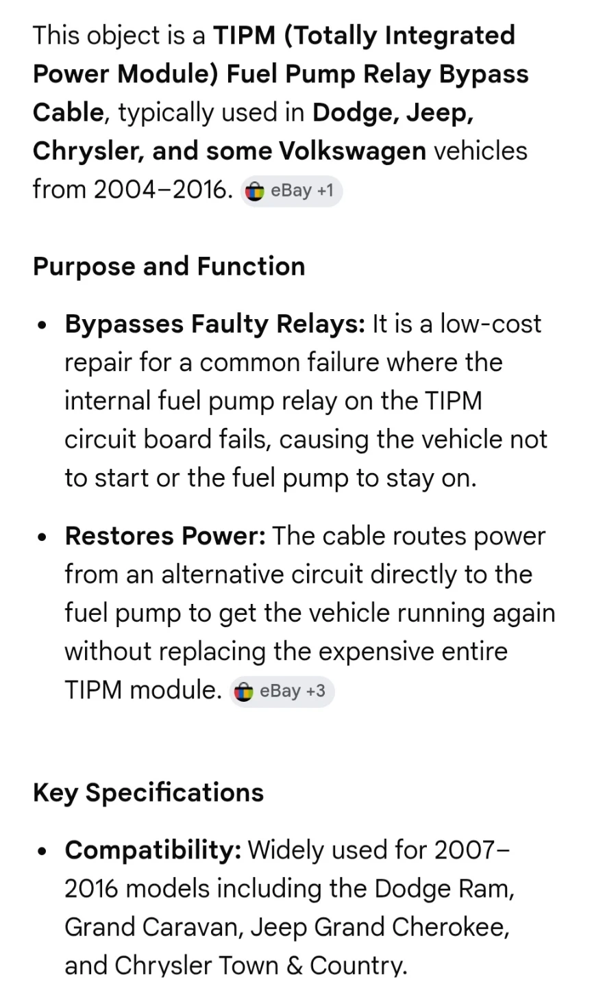 Brand new This is a TIPM Fuel Pump Relay Bypass Cable for Dodge, Jeep, Chrysler, and some Volkswagen vehicles from 2004-2016. It bypasses faulty relays and restores power directly to the fuel pump. The kit includes a red 14 AWG silicone bypass cable and multiple blade-style fuses. This cable is useful for bypassing a failed internal fuel pump relay on the TIPM circuit board without replacing the entire module.