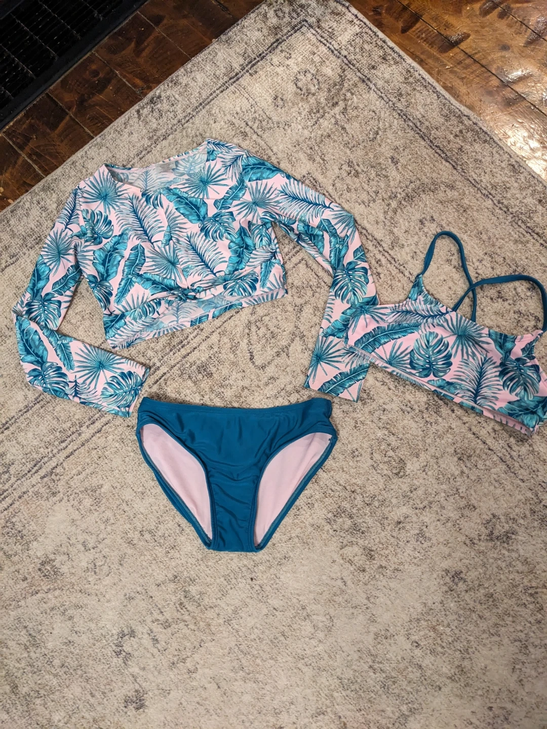 This girls' swimsuit set features a long-sleeve rash guard and bikini topand bottoms with a tropical palm leaf print. The rash guard has a twist-front detail at the hem. It's perfect for a day at the beach or pool!