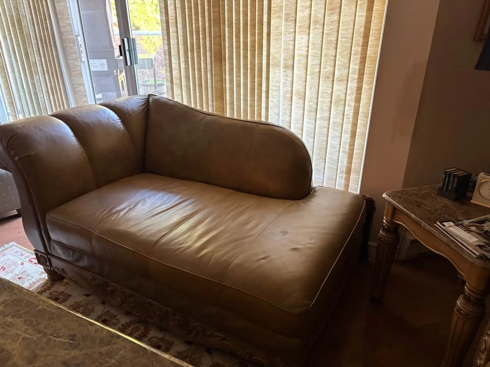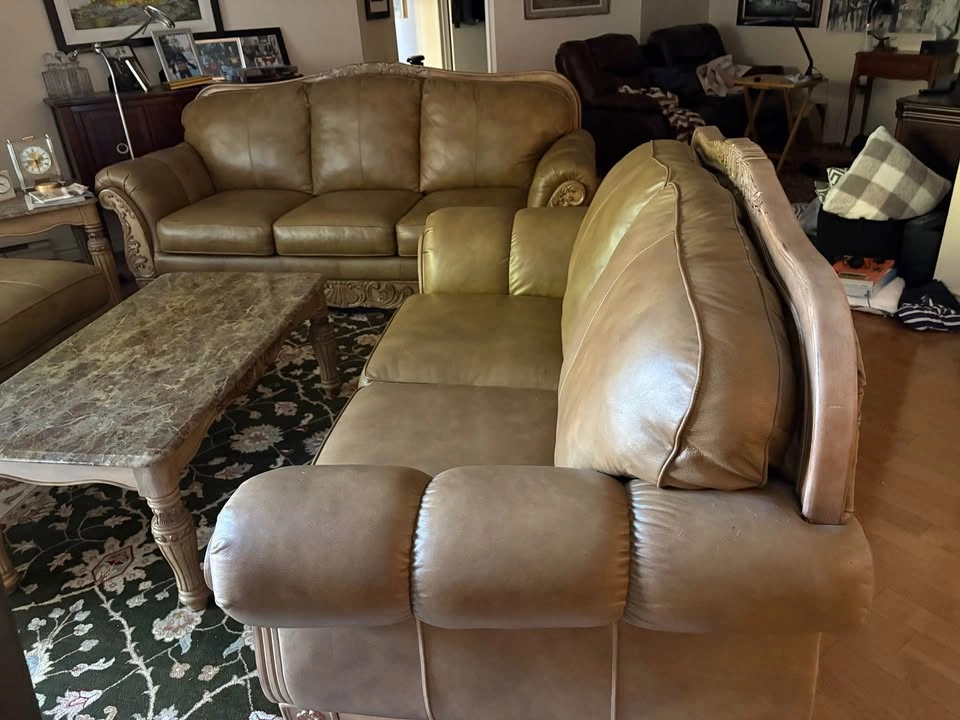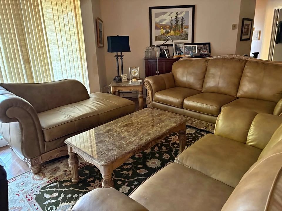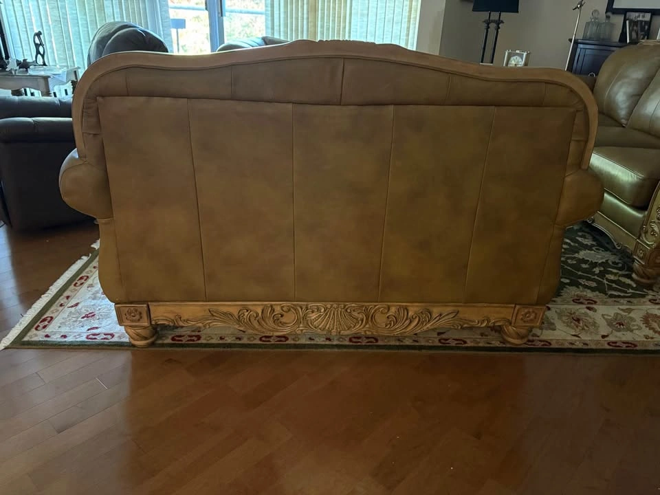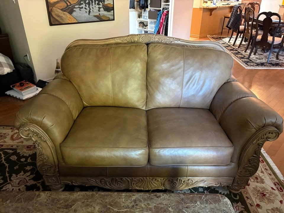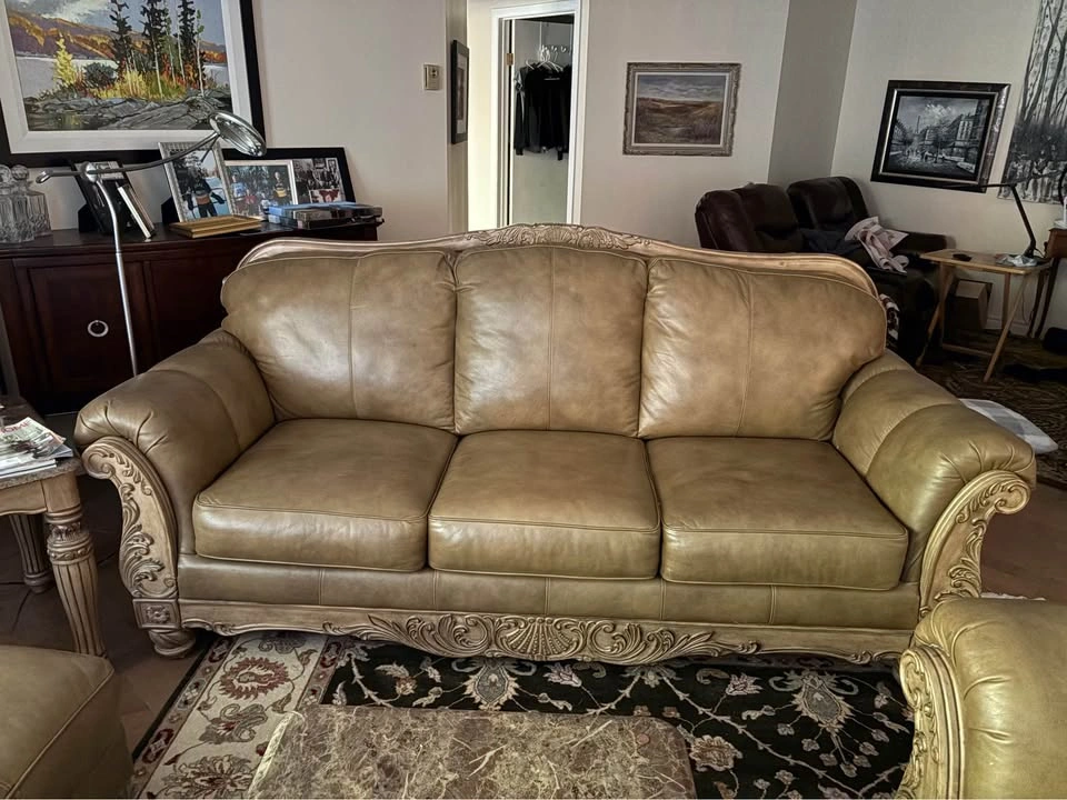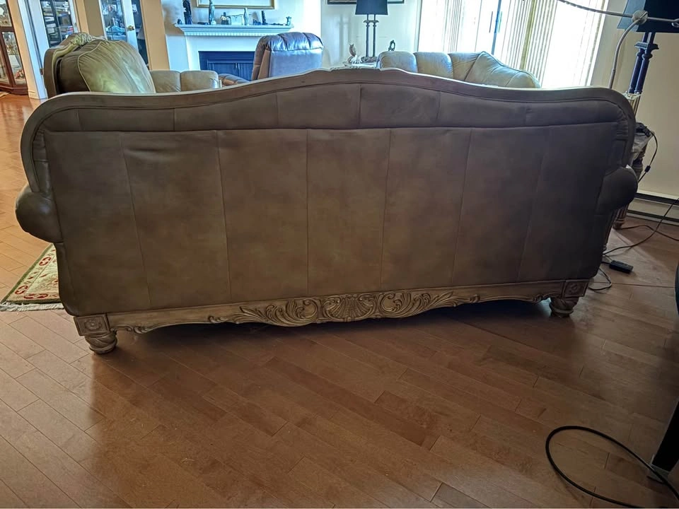 70Ashley "North Shore" All-Leather Sofa, Loveseat & Chaise — Ornate Carved Wood Trim, Brown Leather Elevate your living room with this Signature Design by Ashley Furniture — North Shore all-leather suite, renowned for its timeless traditional styling, rich detailing, and craftsmanship. This collection blends elegance, comfort, and durability — now discontinued and increasingly hard to find. All-leather upholstery (top-grain on all seating surfaces, backs, and arms) in a brown tone that creates depth and luxurious sheen. Plush rolled arms, subtle camel-back shaping, and boxed seat cushions deliver both refined silhouette and exceptional comfort. Ornate carved wood accents with shell and scroll motifs trace the top rails, aprons, and cabriole-style legs — a hallmark of the North Shore line. Durable hardwood frame construction for strength and longevity. A true statement collection — warm, substantial, and classically styled. 📐 Dimensions & Model References Sofa (Model 2260338) — 95″ W × 39″ D × 42″ H Loveseat (Model 2260335) — 69″ W × 39″ D × 42″ H Chaise / Corner Lounge (Model 2260316) — ~70″ W × 40″ D × 35″ H 💰 Pricing Piece Asking Price (CAD) Sofa $600 Loveseat $400 Chaise $300 Full 3-Piece Bundle $950 Save by purchasing the complete matching set. Will consider reasonable offers. ✅ Condition & Buyer Information Good structural integrity; well maintained in a smoke-free, pet-free home. Extremely solid and heavy furniture — built with hardwood framing and ornate trim Will require partial disassembly for removal (legs and wood trim detach easily with basic tools) Buyer responsible for disassembly and transport. Must bring adequate help to move furniture. Available in White Rock, BC