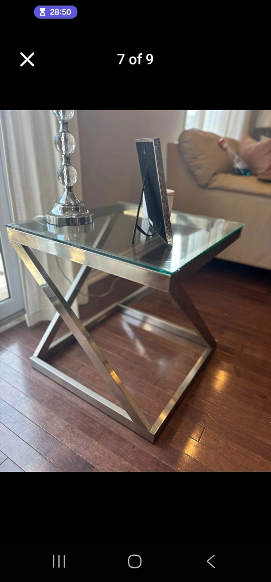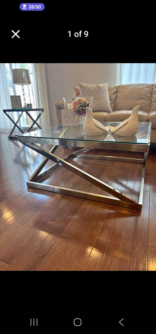 Selling a coffee table and matching end table set with glass tops and a unique, modern design. The frames appear to be a brushed metal finish. They're in great shape and would look lovely in any living room!