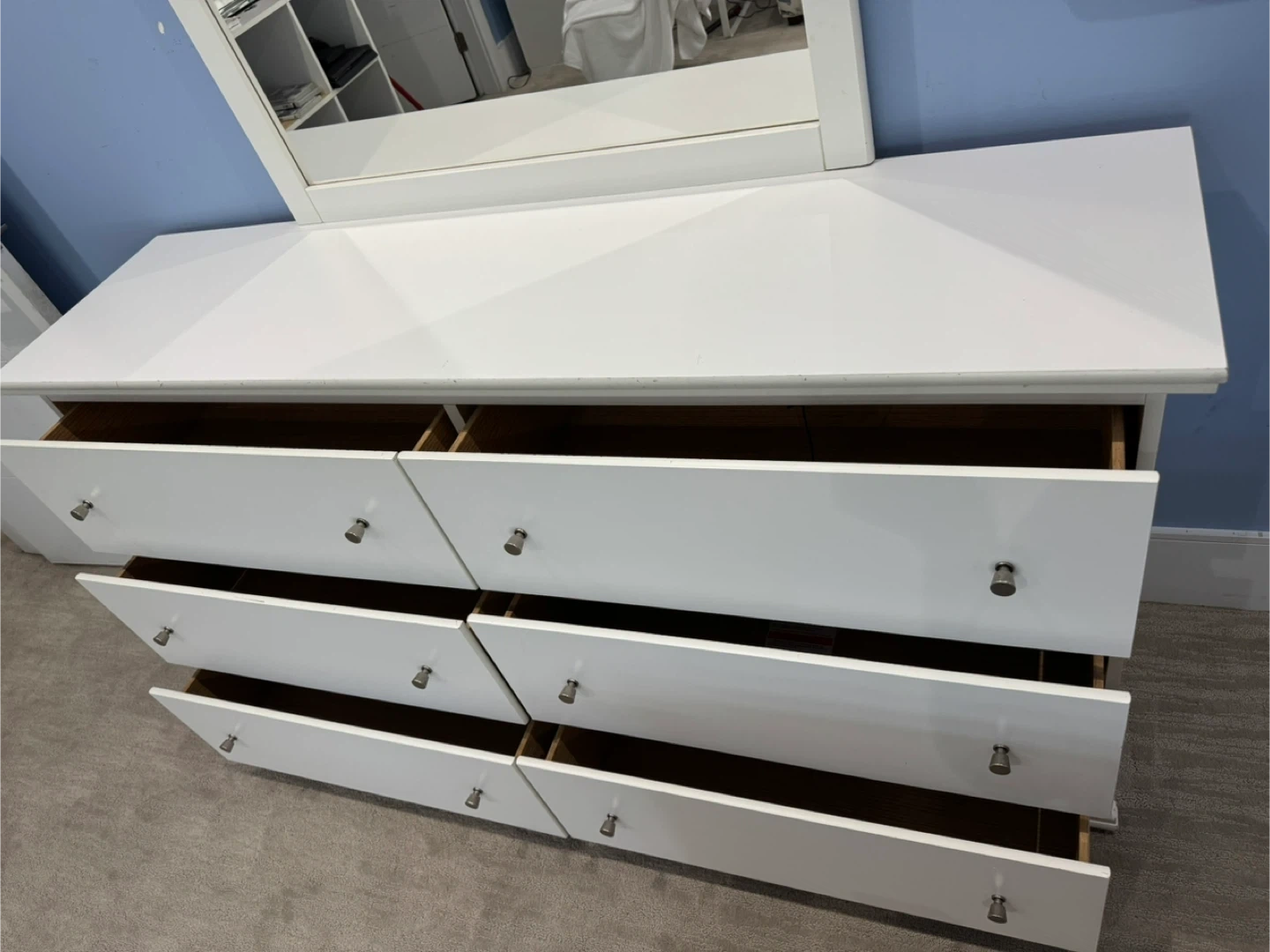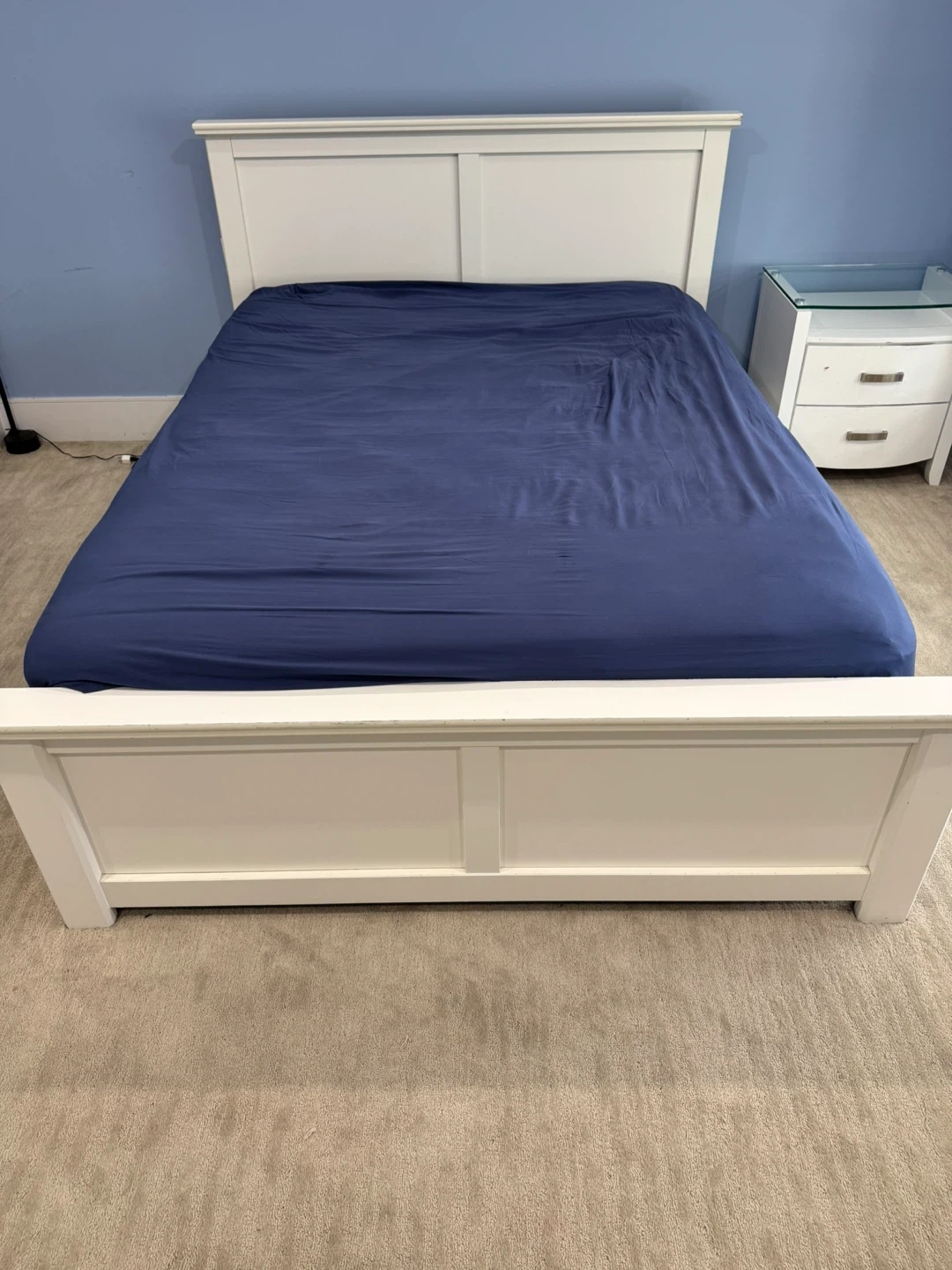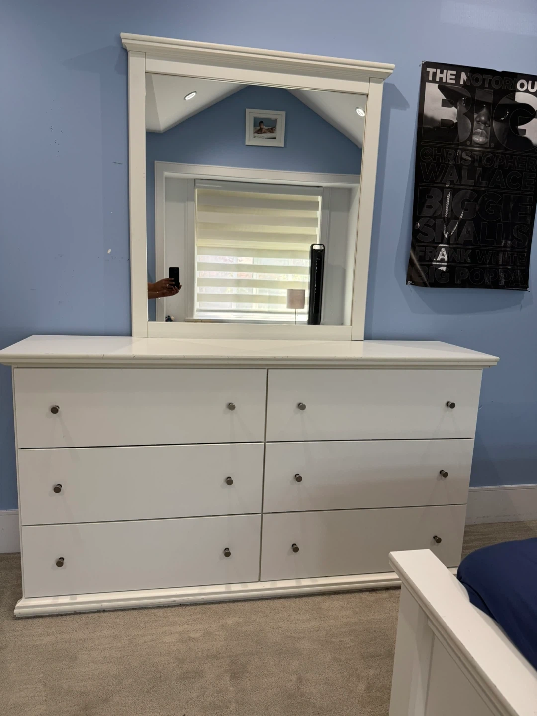Selling an Ashley Queen bedroom set in good condition! Includes a bed, dresser with a mirror, and a nightstand. All pieces are white. Perfect for furnishing a room! Please note the nightstand has some scratches. Mattress not included.
