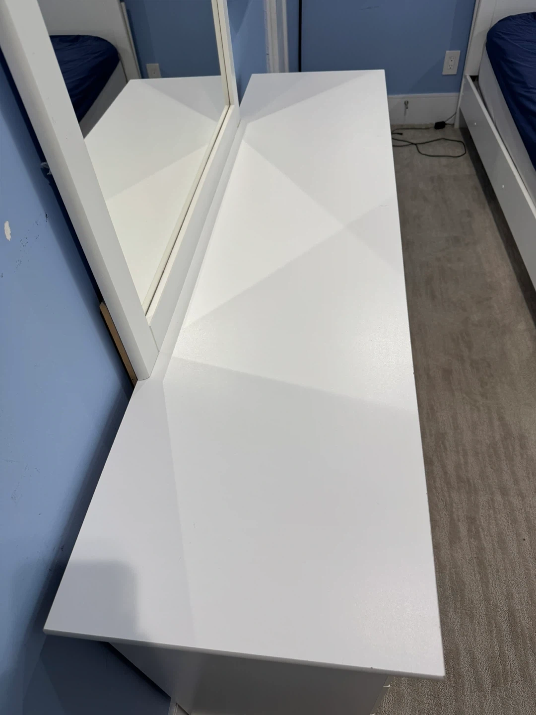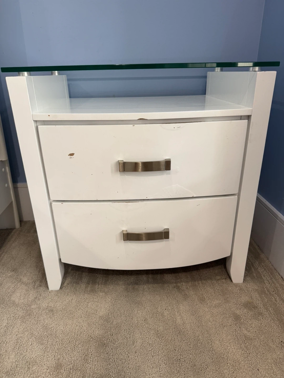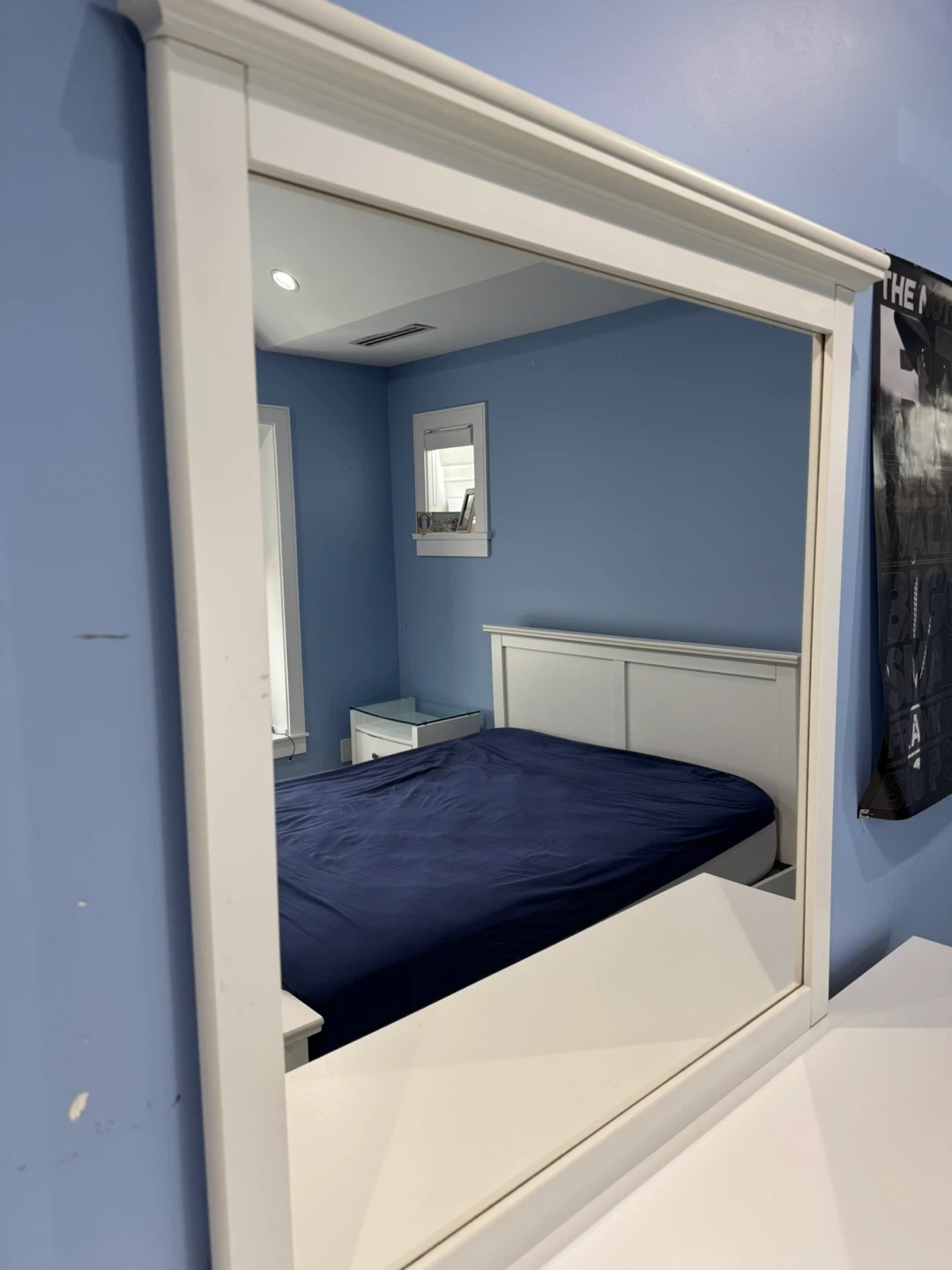 Selling an Ashley Queen bedroom set in good condition! Includes a bed, dresser with a mirror, and a nightstand. All pieces are white. Perfect for furnishing a room! Please note the nightstand has some scratches. Mattress not included.