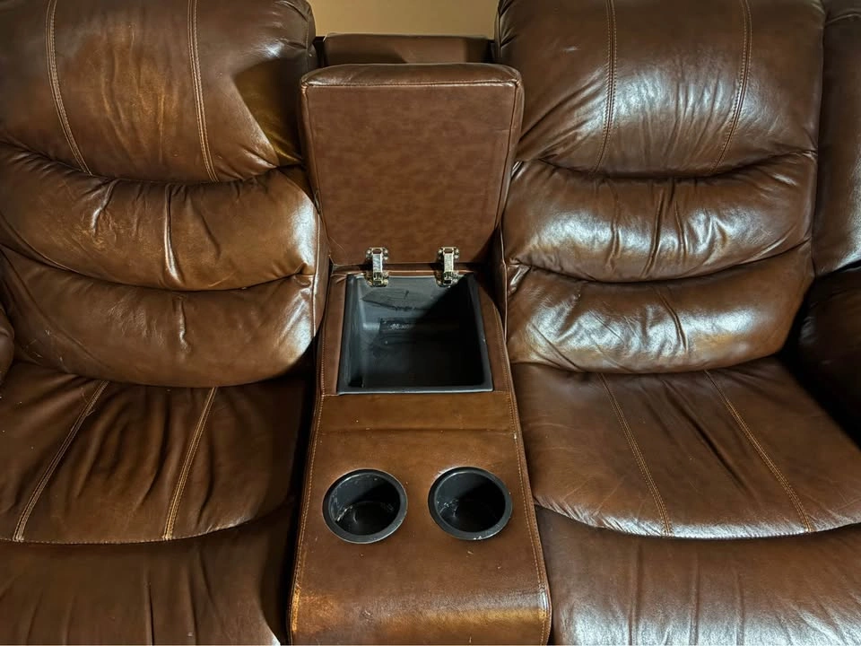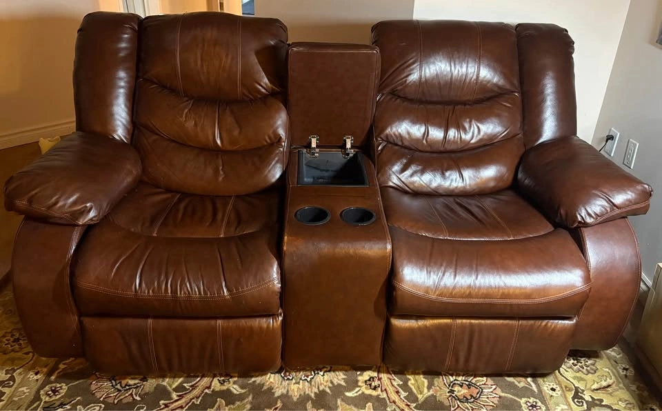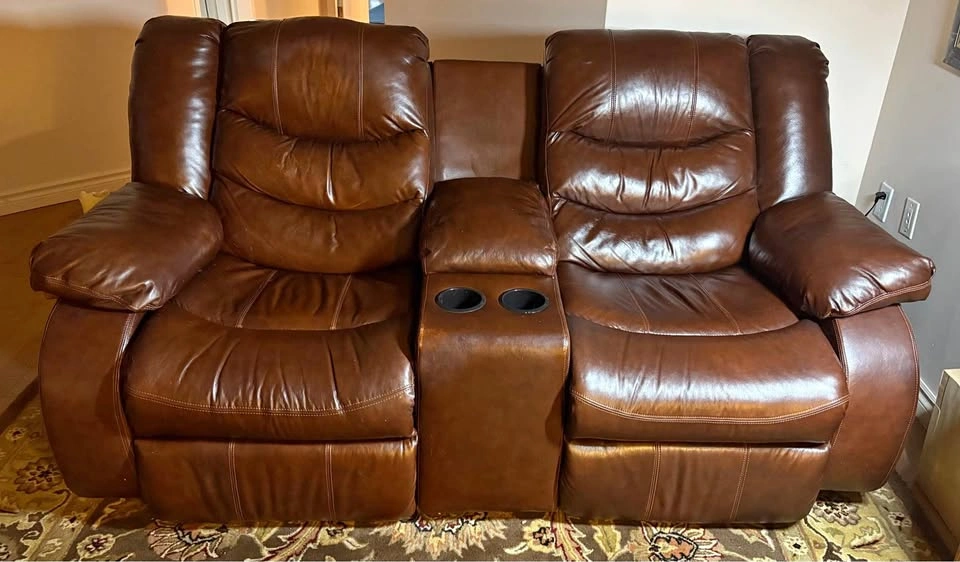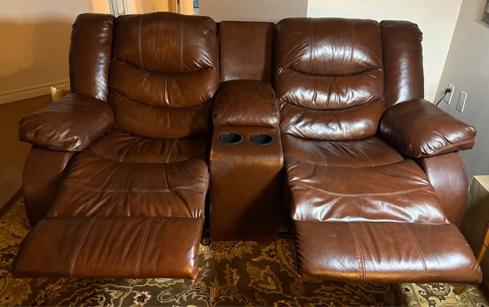 Comfy 2-seat recliner from Ashley in a rich “Saddle” brown. Both seats recline and the center console has lift-top storage + dual cupholders—great for movies or gaming. Upholstery: Leather-match (real leather in the seating areas; vinyl on sides/back) Color: Saddle brown Configuration: 2 manual recliners + center console Approx. size: 78″ W × 40″ D × 40″ H Condition: Used; normal wear consistent with age. (See photos.) Pickup in White Rock. Bring help—it’s heavy.